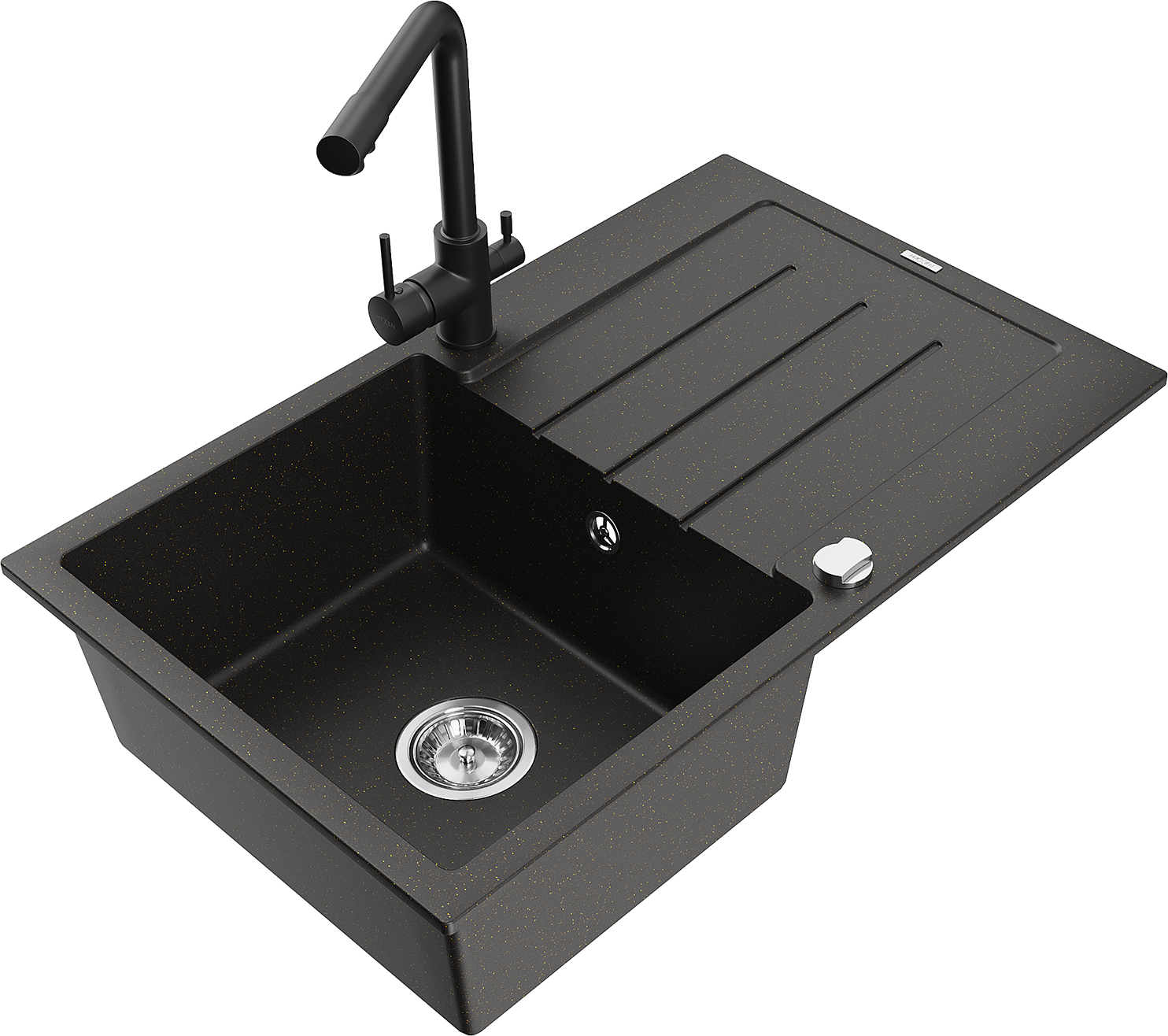 Mexen Bruno granieten gootsteen 1-kompartment met afdruiprek en Duero keukenmengkraan, zwart/goud metallic - 6513-75-671600-70