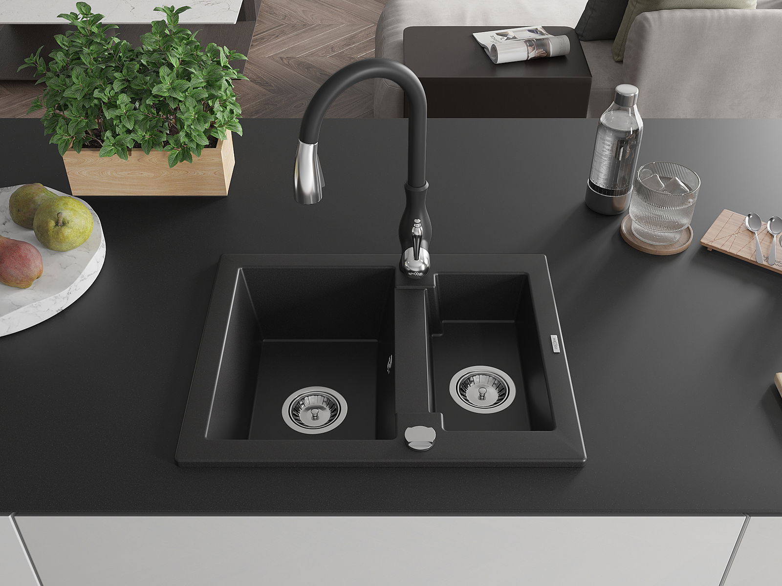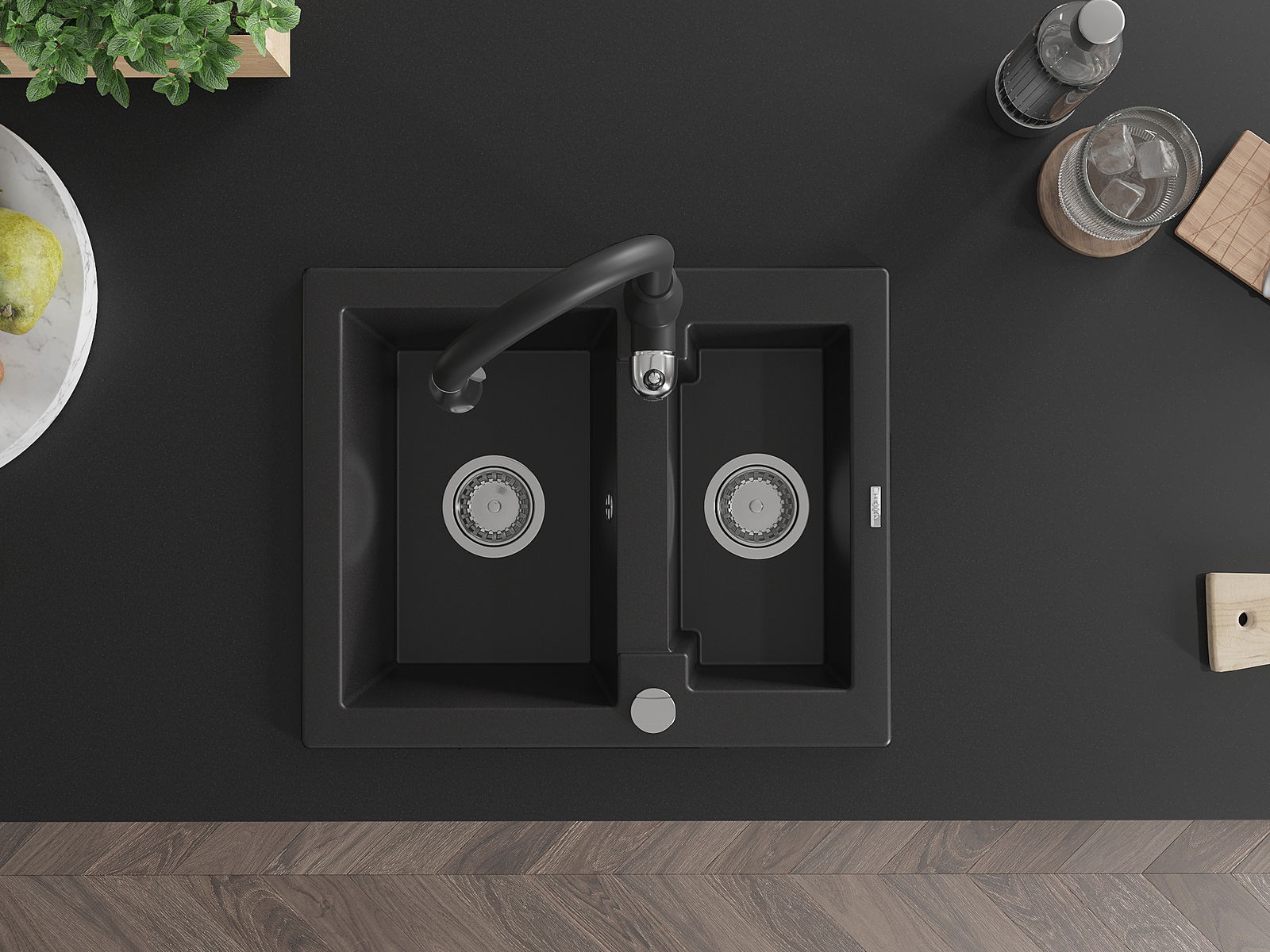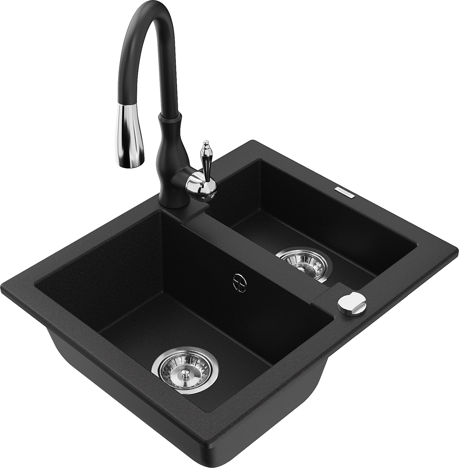 Mexen Carlos granieten spoelbak 1,5-komor met keukenmengkraan Savita, zwart - 6518-77-672601-70