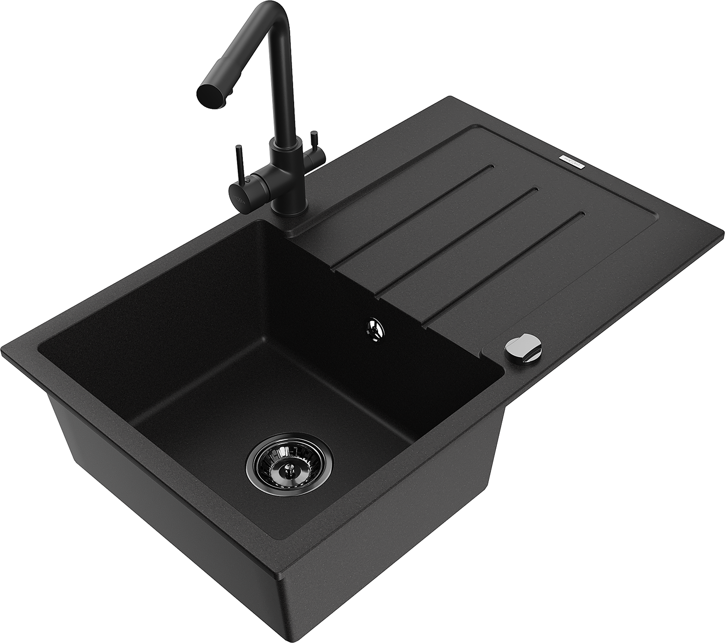Mexen Bruno granieten spoelbak met 1 bak met afdruiprek en keukenmengkraan Duero, zwart - 6513-77-671600-70-B