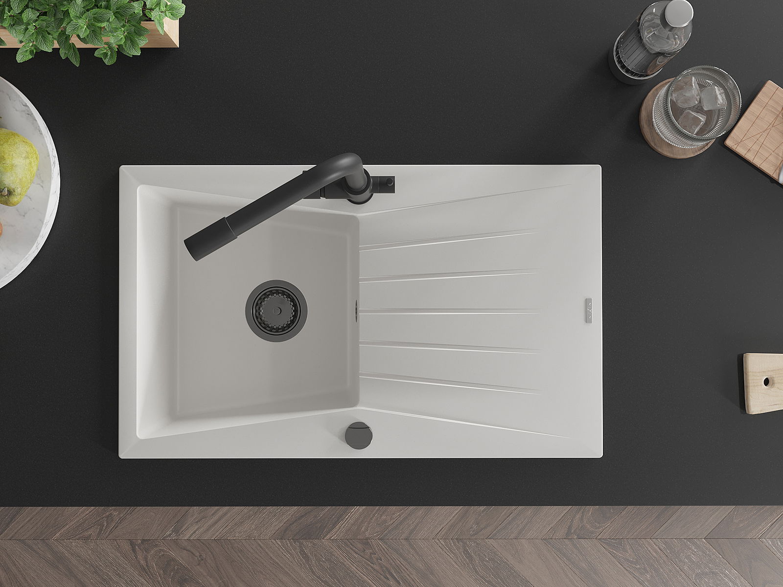 De gootsteen is gemaakt van hoogwaardig graniet. Het vormt een elegante en vooral praktische aanvulling op elke keuken, ongeacht de stijl ervan. De hoge kwaliteit en duurzaamheid van graniet garanderen jarenlang gebruik.