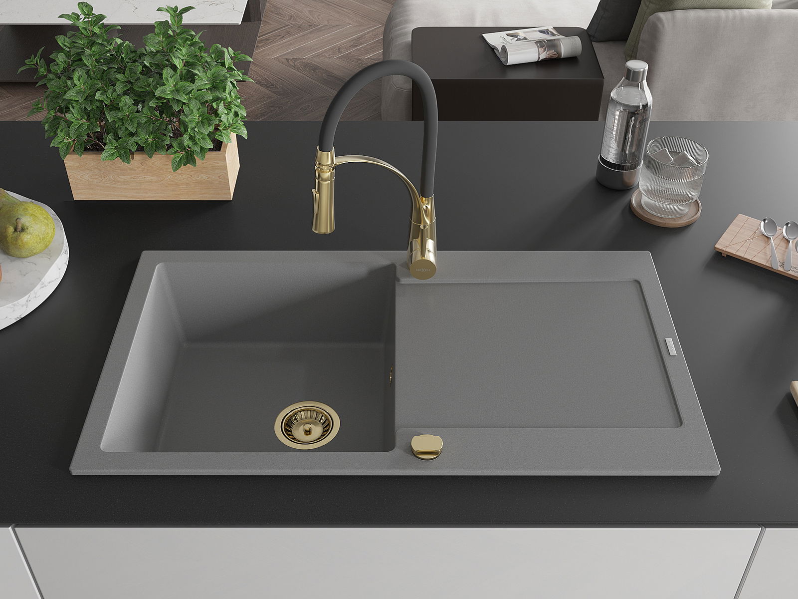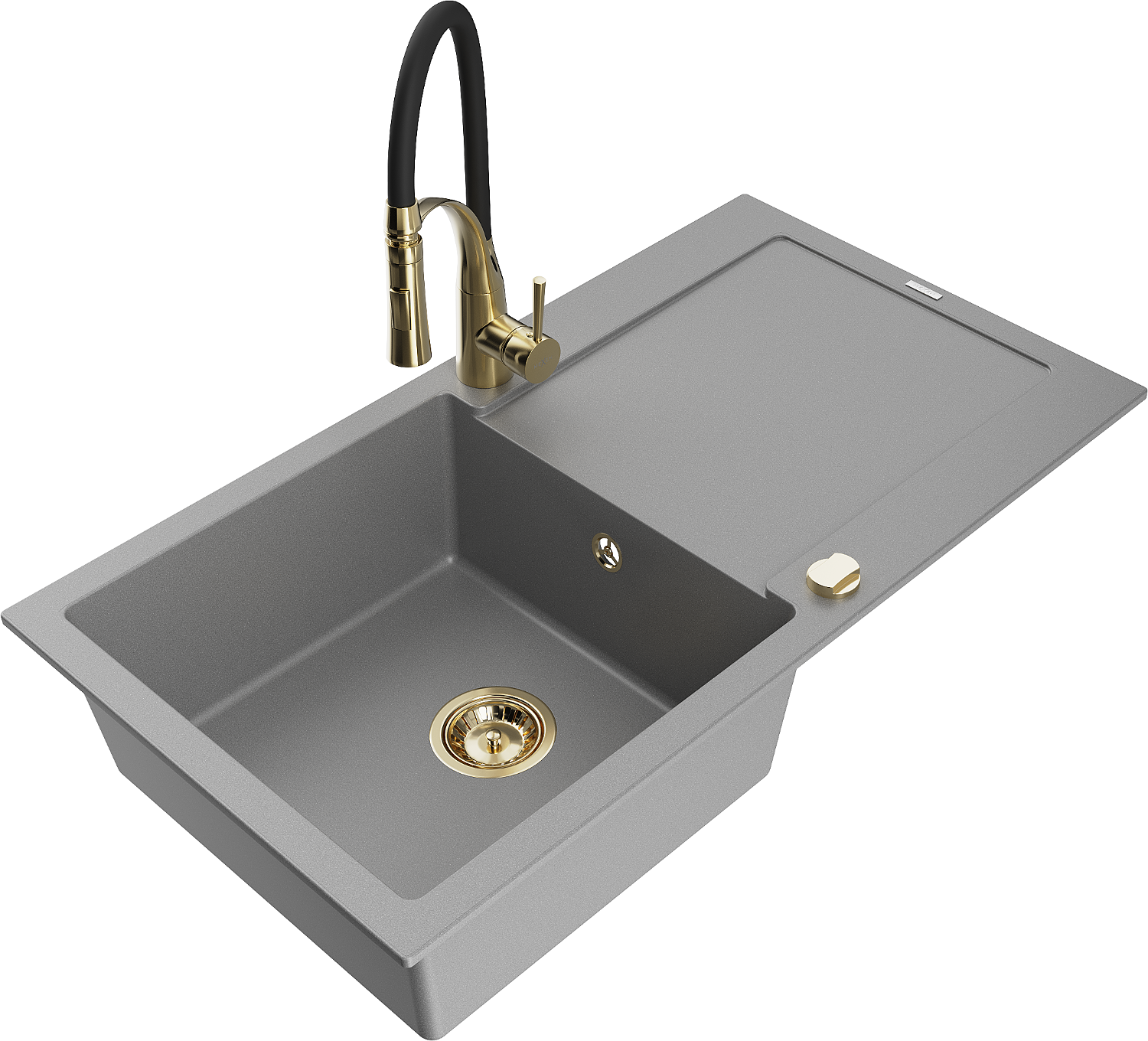 Mexen Leo granieten spoelbak 1-kompartiment met afdruiprek en keukenkraan Aster, grijs - 6501-71-73450-57-G