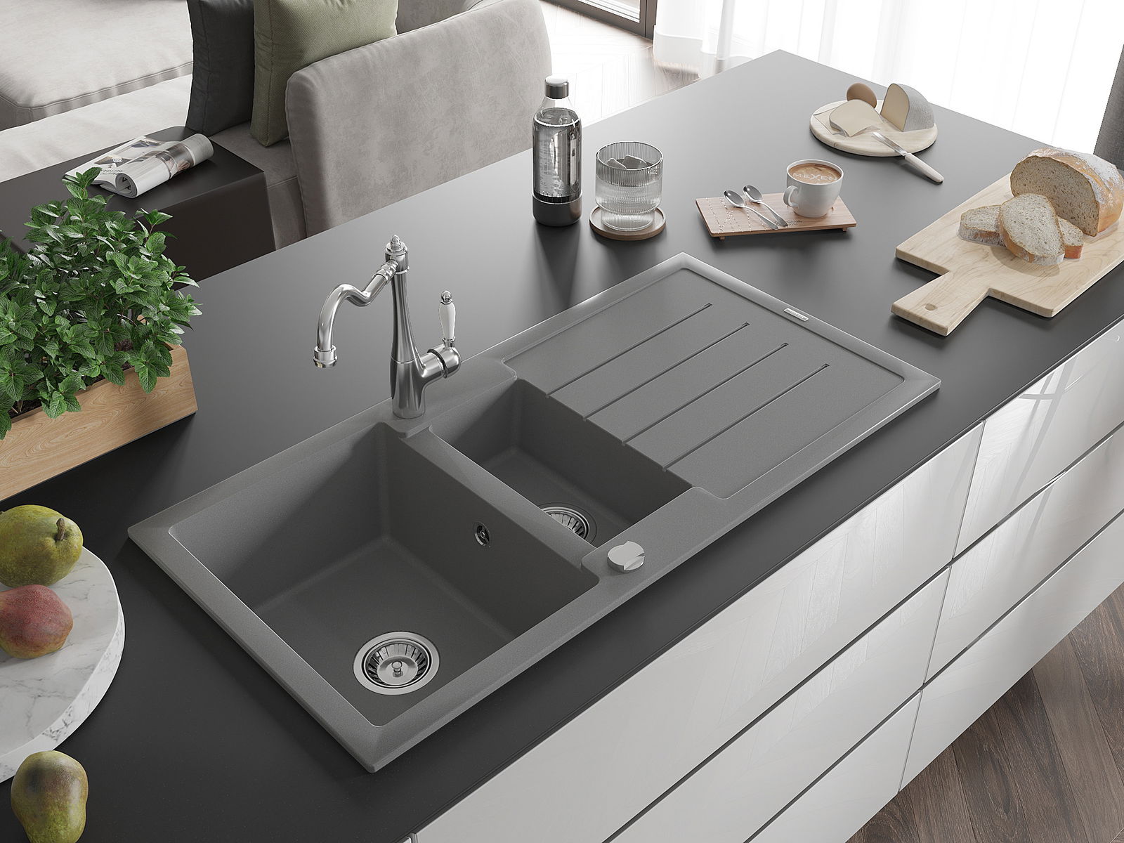 De gootsteen is gemaakt van hoogwaardig graniet. Het vormt een elegante en vooral praktische aanvulling op elke keuken, ongeacht de stijl. De hoge kwaliteit en duurzaamheid van graniet zorgen voor jarenlang gebruik.