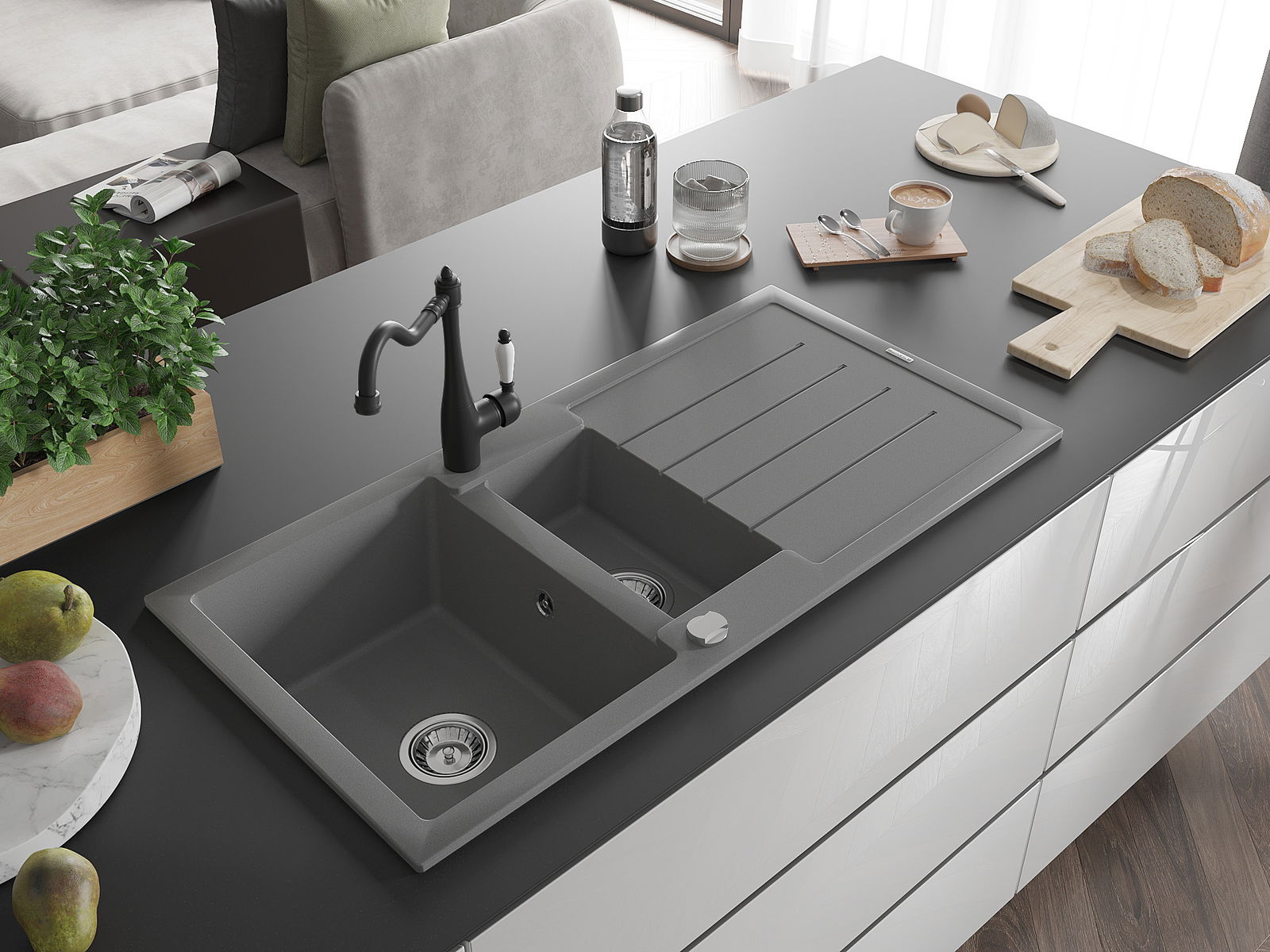 Mexen Andres granieten gootsteen 1,5-komer met afdruiprek en keukenmengkraan Carla, grijs - 6515-71-670700-70