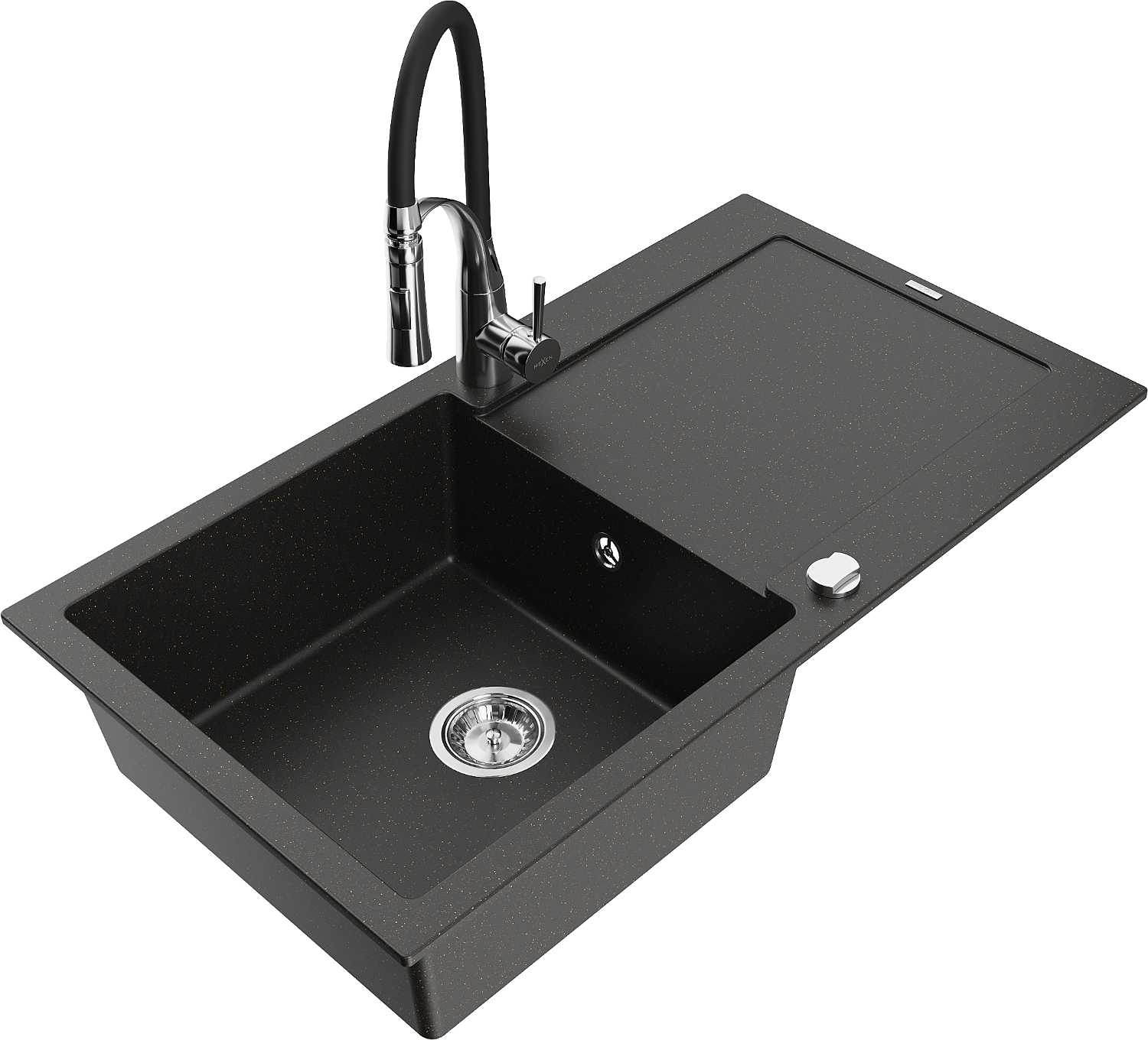 Mexen Leo granieten gootsteen 1-komoers met afdruiprek en keukenmengkraan Aster, zwart/goud metallic - 6501-75-73450-07