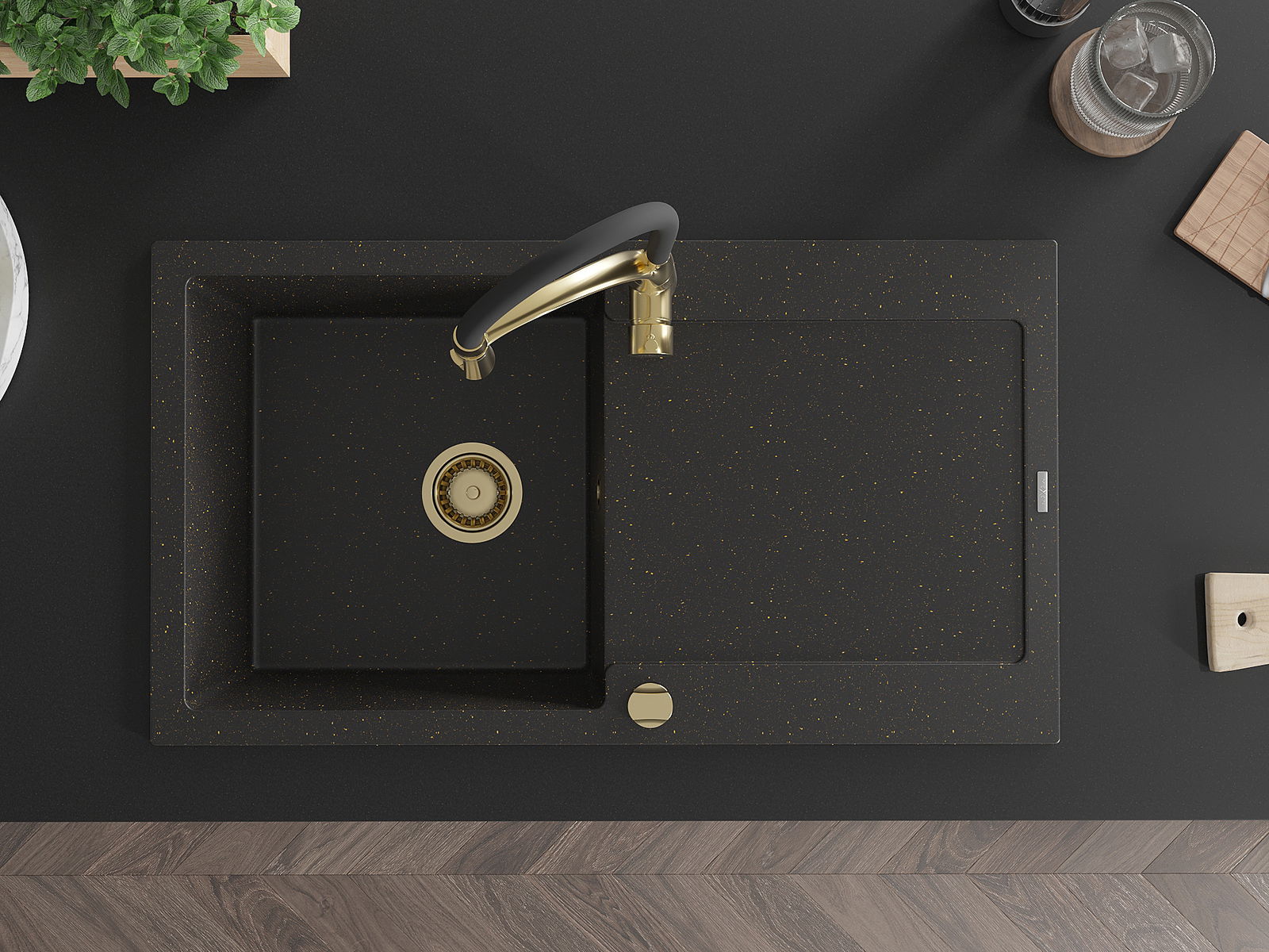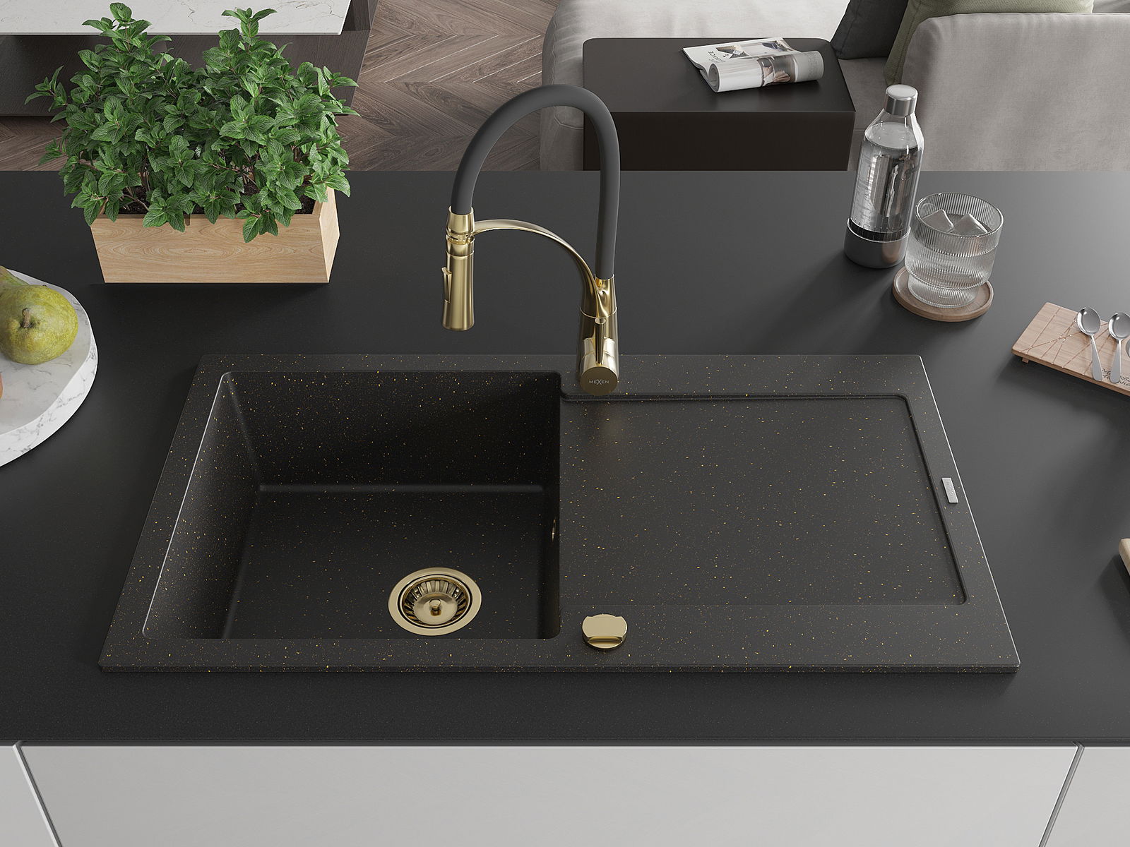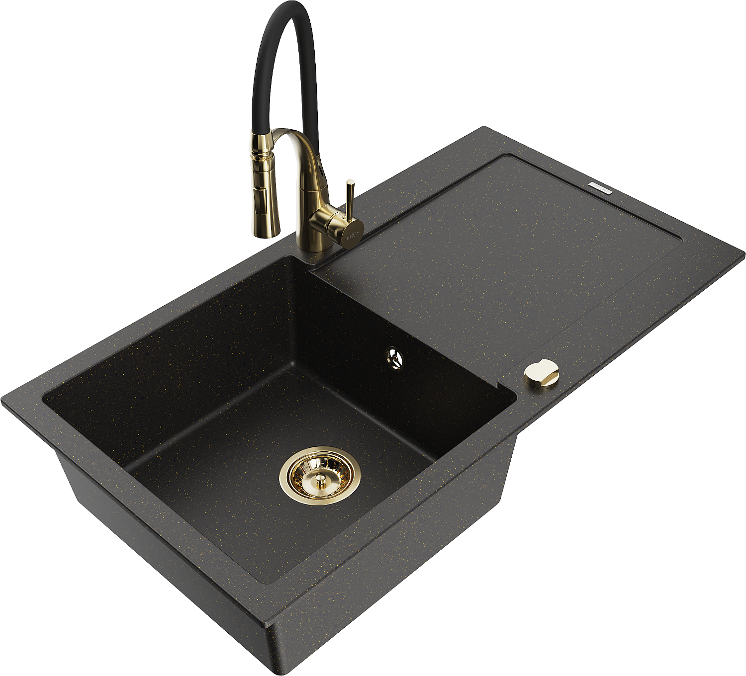 Mexen Leo granieten spoelbak 1-komor met afdruiprek en keukenkraan Aster, zwart/goud metallic - 6501-75-73450-57-G