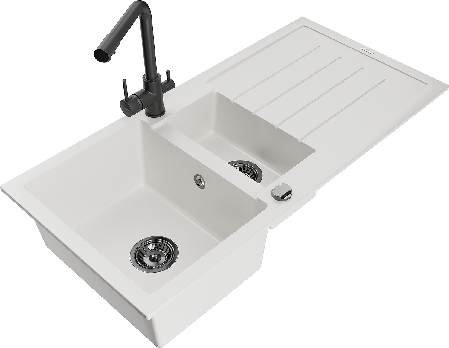 Mexen Andres granieten gootsteen 1,5-kamerig met afdruiprek en keukenmengkraan Duero, wit - 6515-20-671600-70