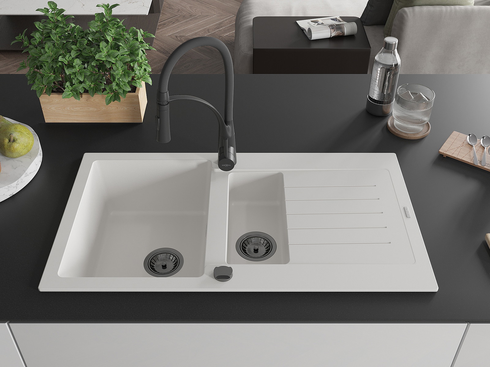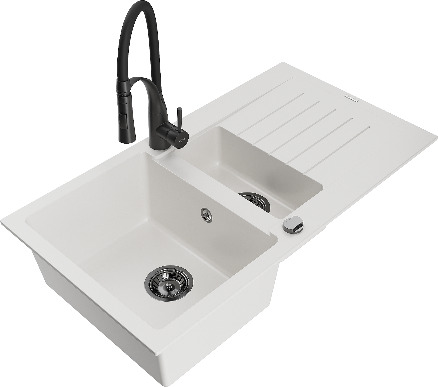 Mexen Matias granieten gootsteen 1,5-komers met afdruiprek en keukenmengkraan Aster, wit - 6502-20-73450-70-B
