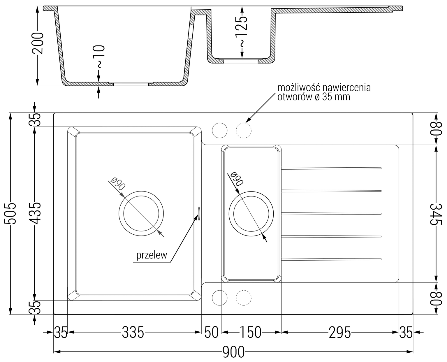 De gootsteen heeft 2 voorgeboorde gaten met een diameter van 35 mm, die zelfstandig kunnen worden uitgeslagen. Ze kunnen onder andere worden gebruikt voor de installatie van een dispenser voor vloeistof, die de aanwezigheid van plastic flessen in de keuken elimineert en het een elegante afwerking geeft.
