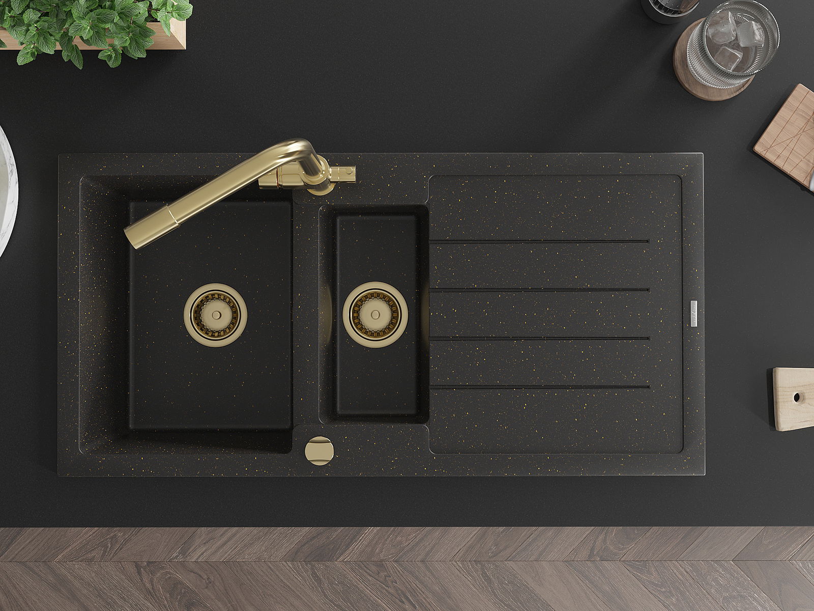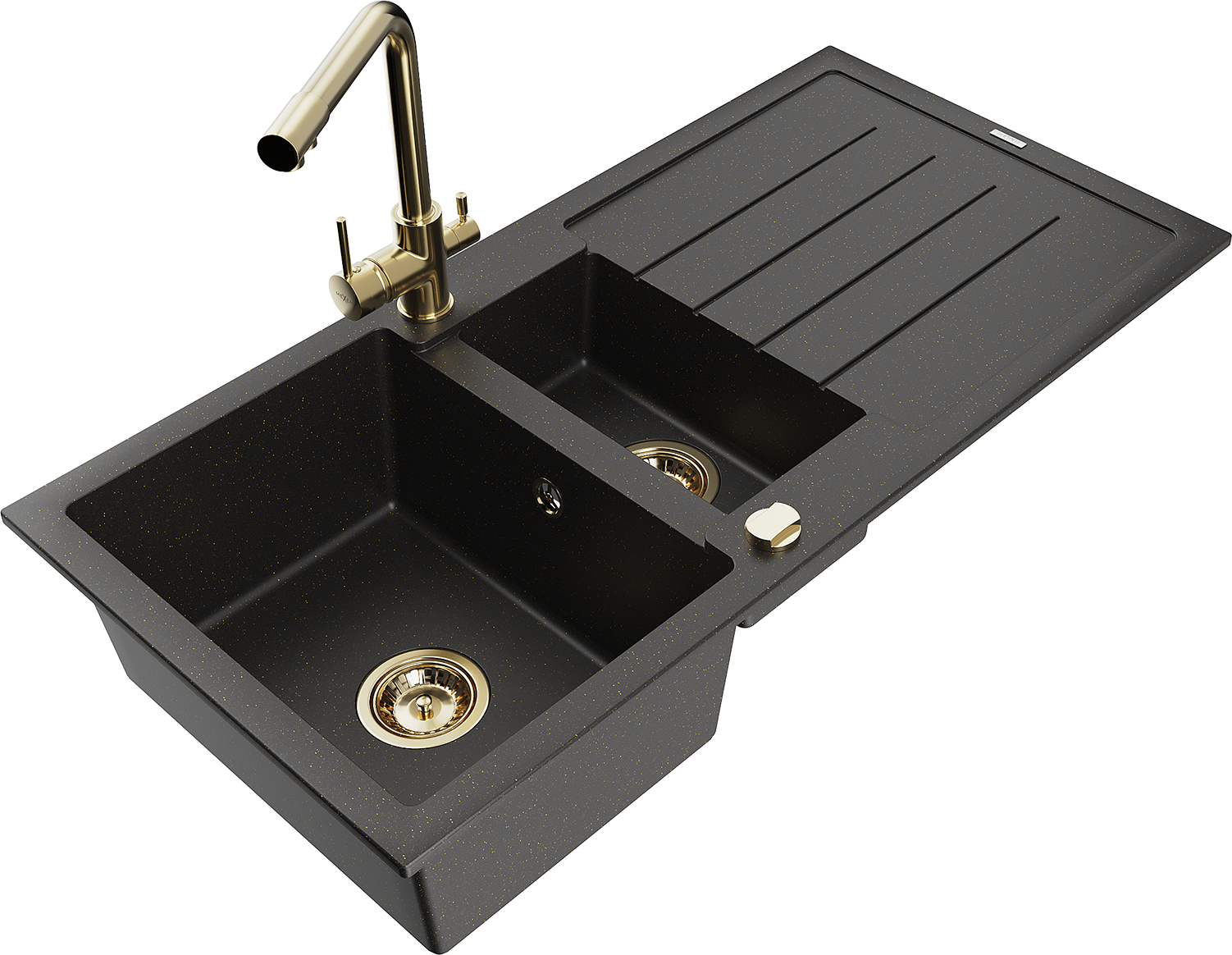 Mexen Andres granieten spoelbak 1,5-vaks met afdruipplaat en keukenkraan Duero, zwart/goud - 6515-75-671600-50