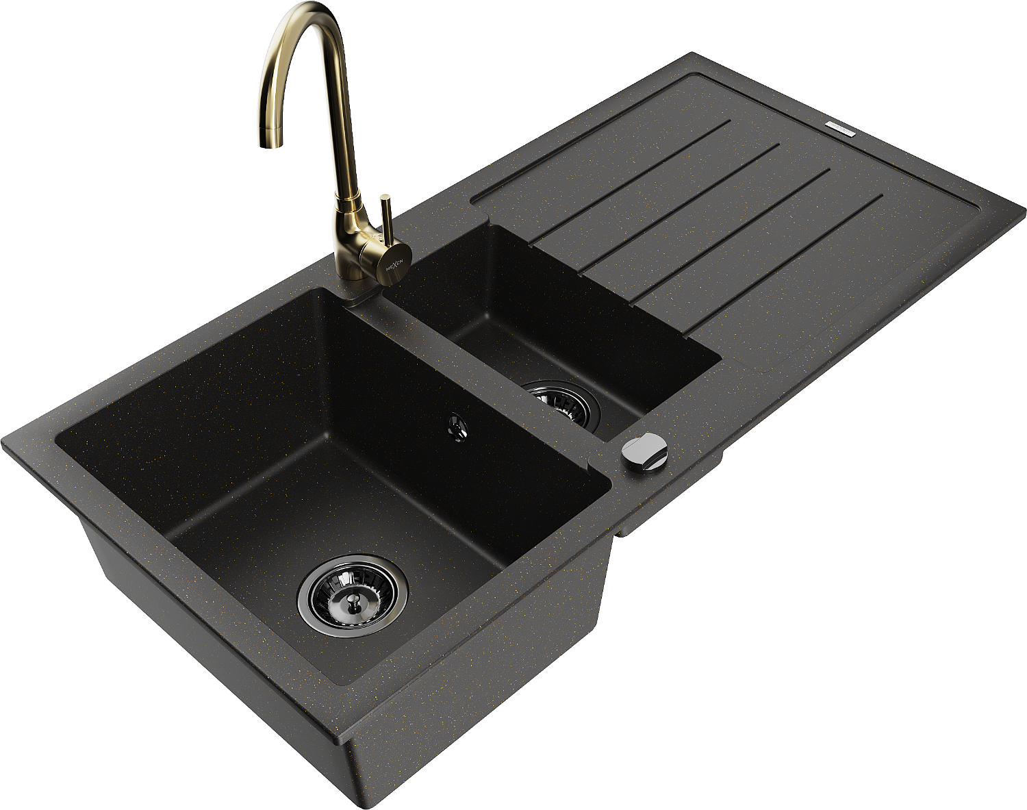 Mexen Andres granieten spoelbak 1,5-komer met afdruiprek en keukenkraan Telma, zwart/goud - 6515-75-670200-50-B