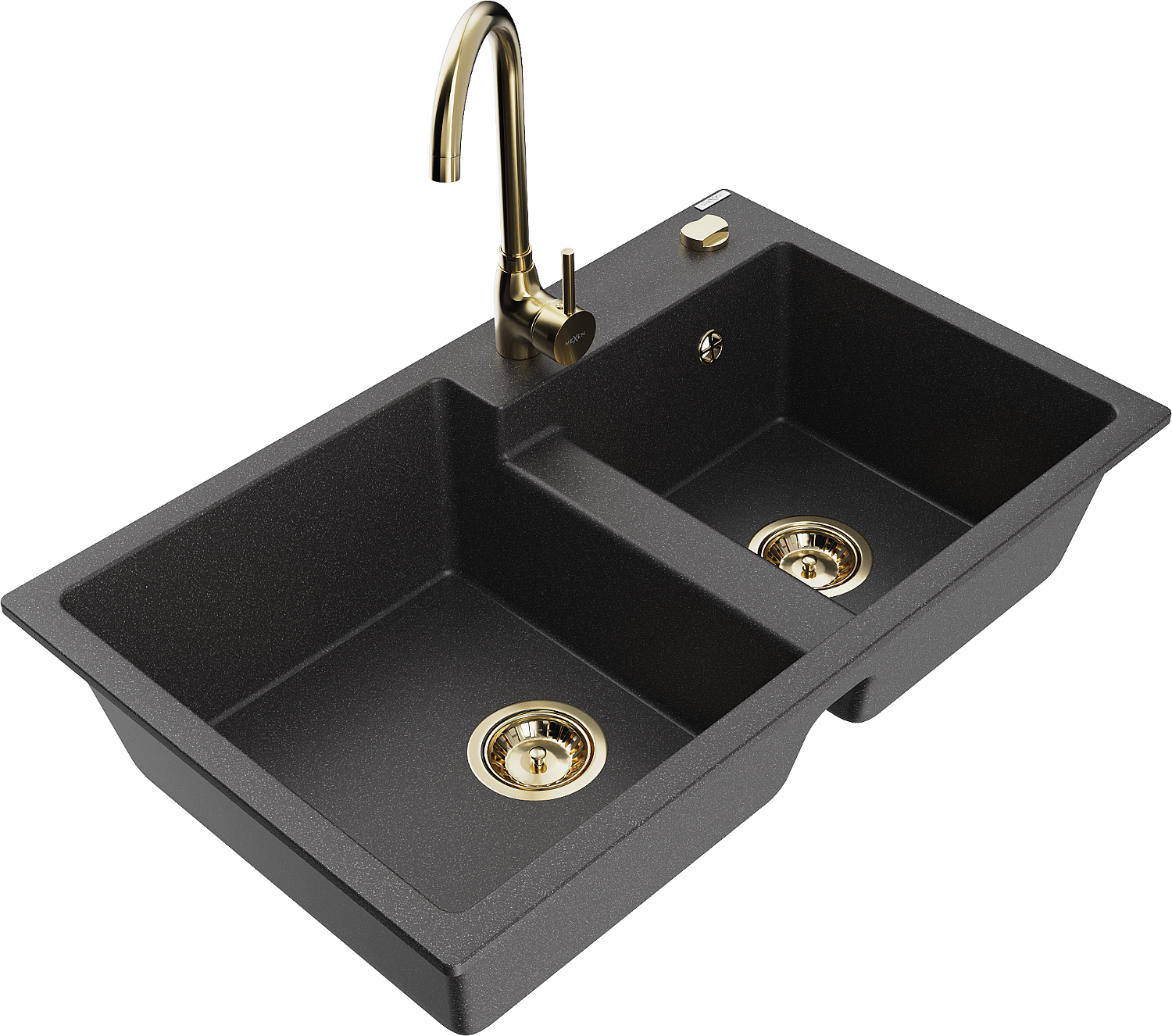 Mexen Tomas granieten 2-komoren gootsteen met Telma keukenkraan, zwart gespikkeld - 6516-76-670200-50