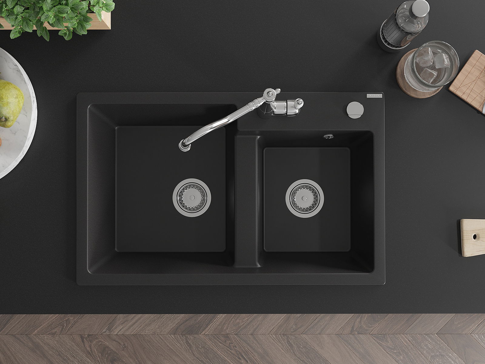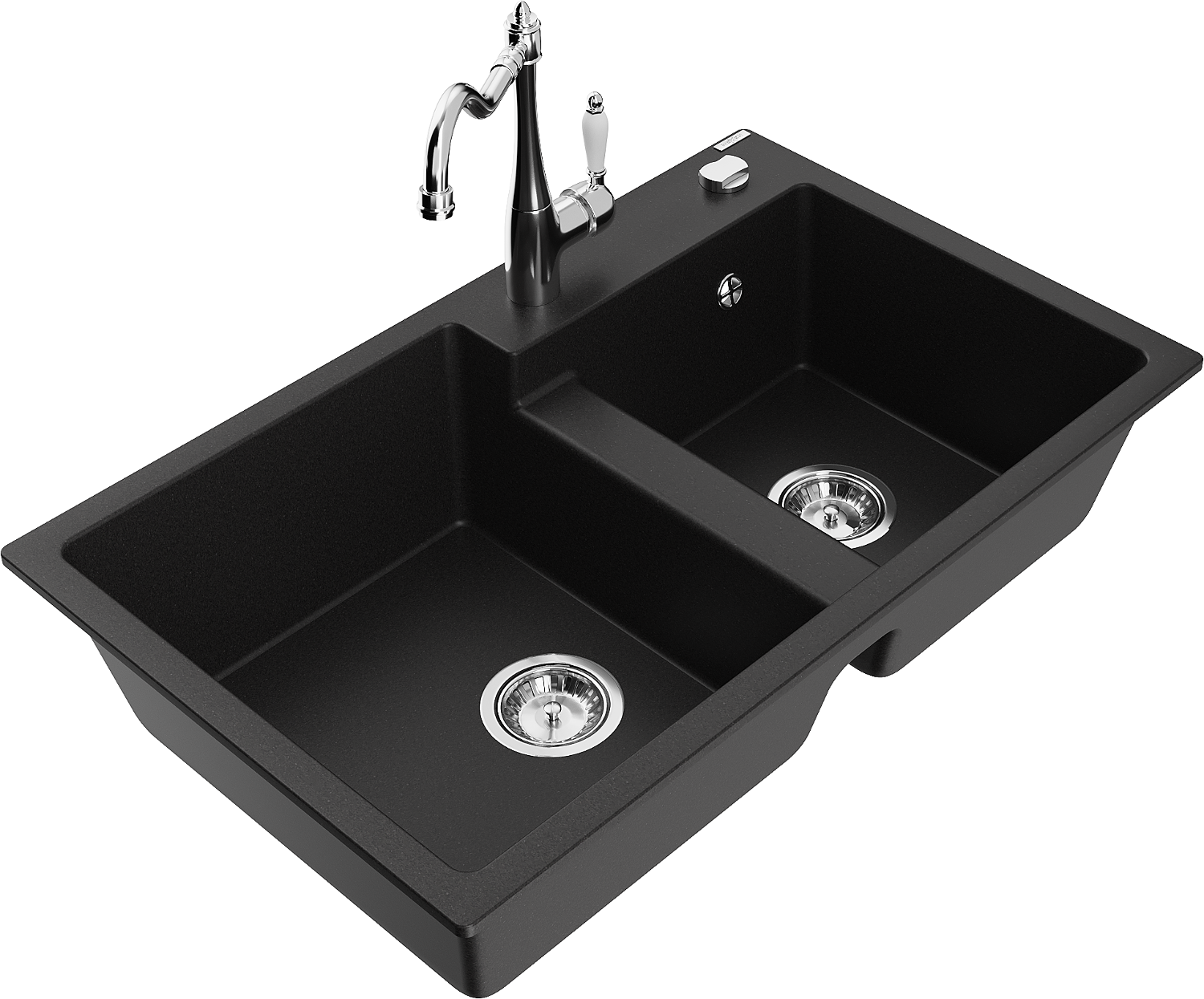 Mexen Tomas granieten spoelbak met 2 kamers en keukenmengkraan Carla, zwart - 6516-77-670700-00