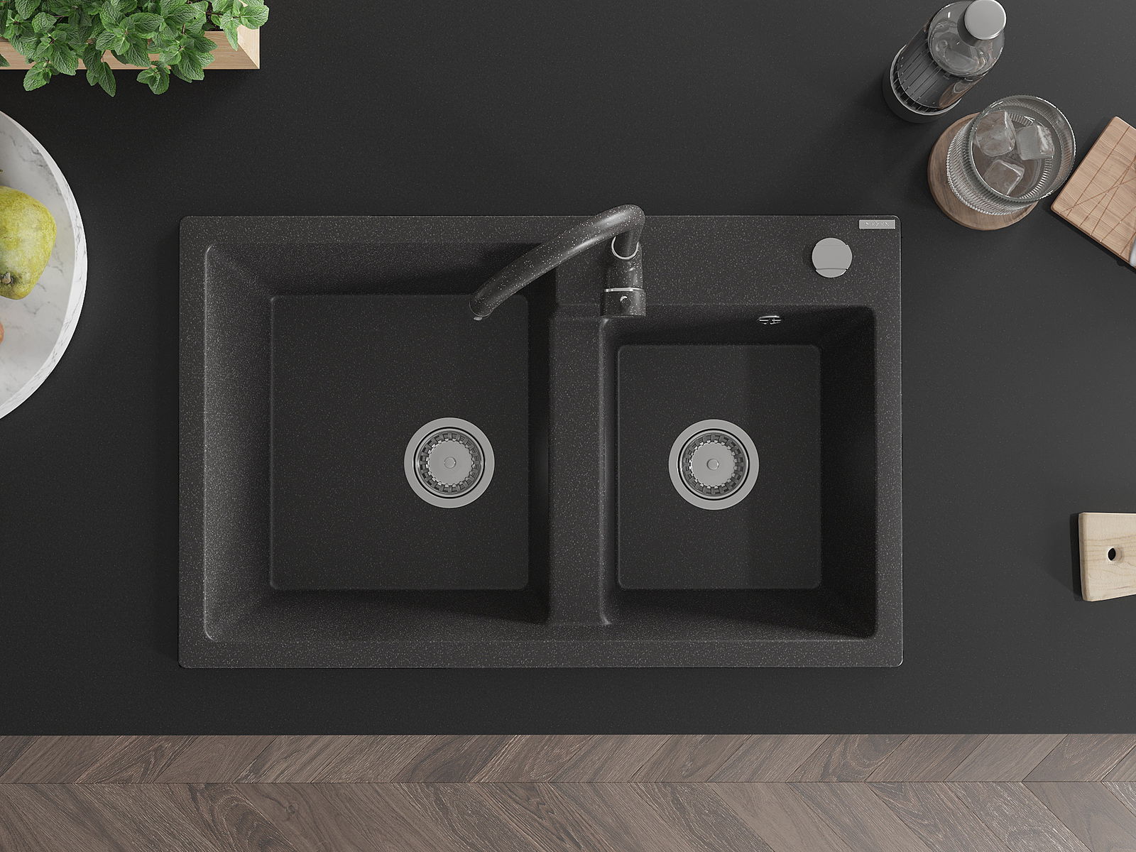 Mexen Tomas 2-kamer gootsteen van graniet met Telma keukenmengkraan, zwart gespikkeld - 6516-76-670200-76