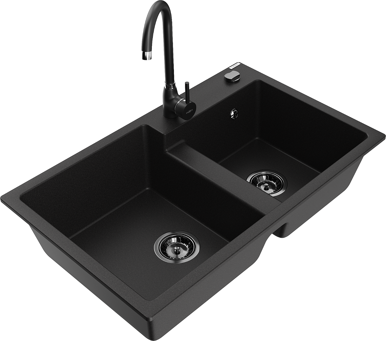 Mexen Tomas granieten gootsteen 2-kamers met keukenkraan Telma, zwart - 6516-77-670200-70-B