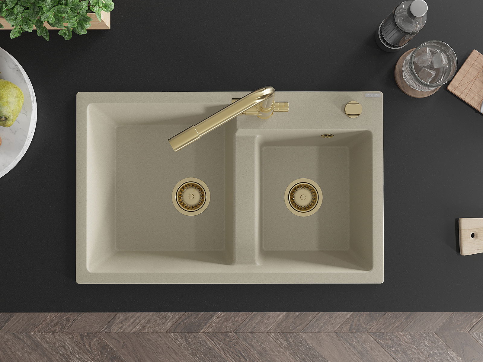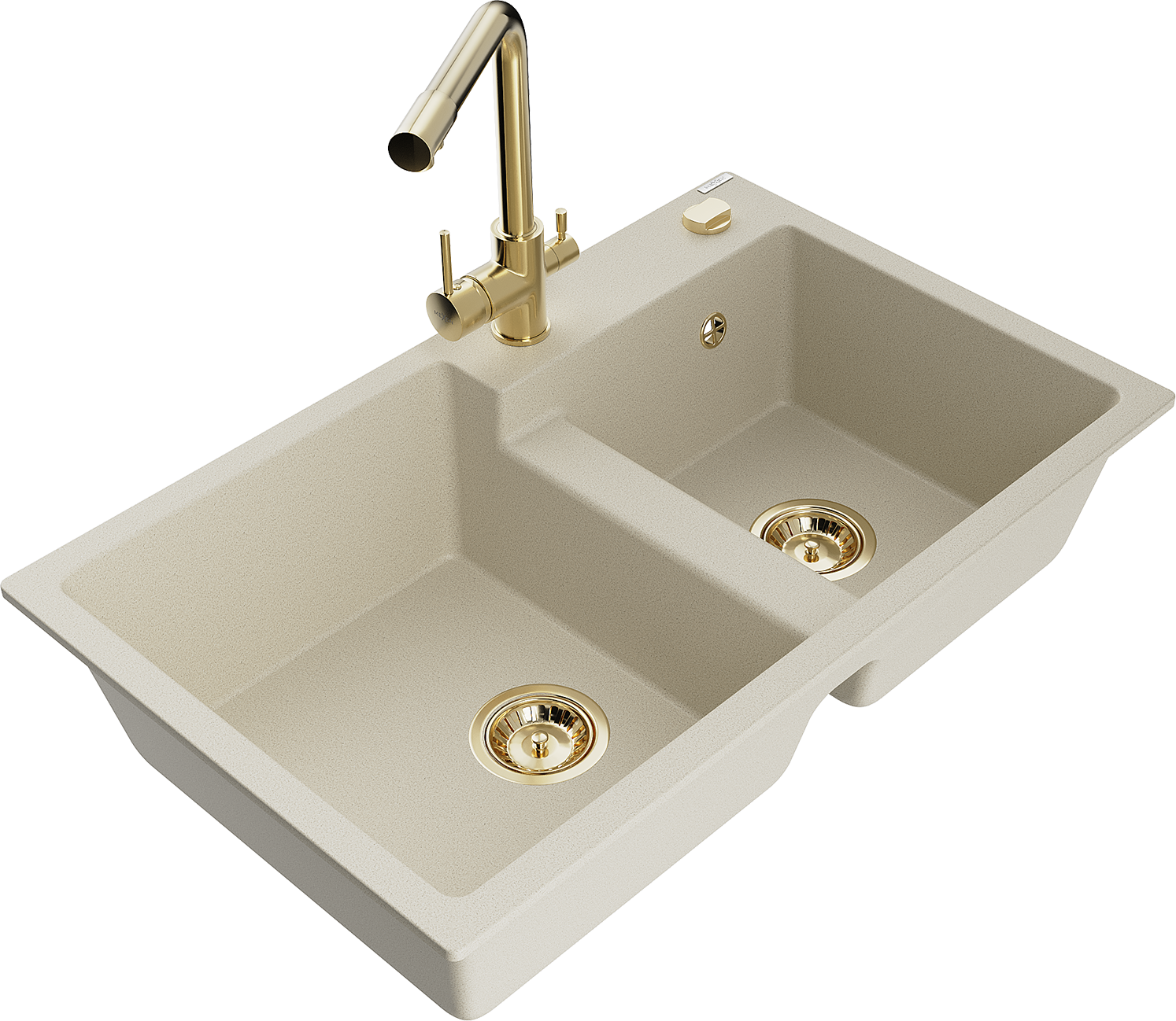 Mexen Tomas granieten spoelbak met 2 kamers en keukenmengkraan Duero, beige - 6516-69-671600-50