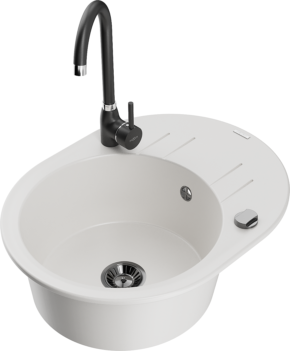 Mexen Kevin granieten spoelbak 1-komorig met afdruiprek en keukenkraan Telma, wit - 6517-20-670200-70