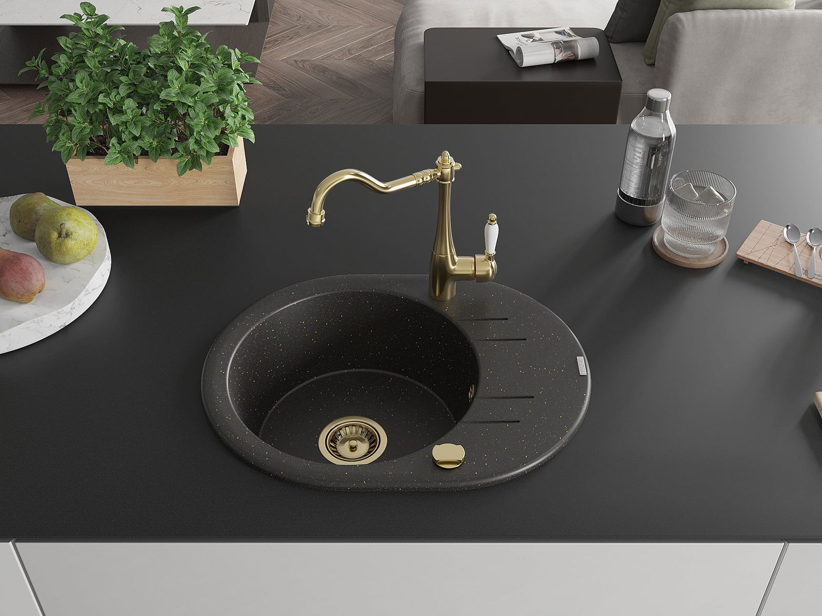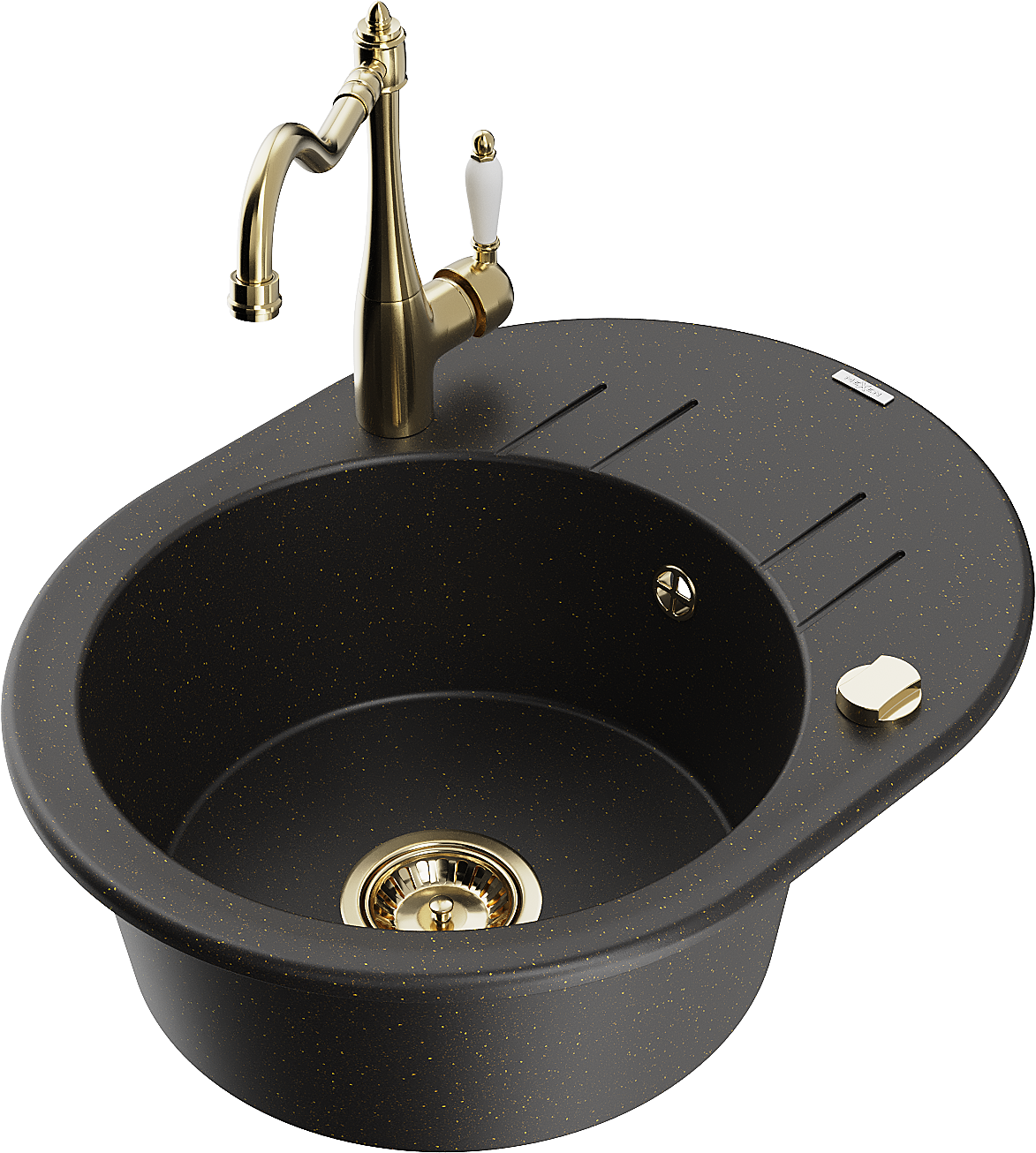 Mexen Kevin granieten gootsteen 1-kompartement met afdruiprek en keukenmengkraan Carla, zwart/goud metallic - 6517-75-670700-50