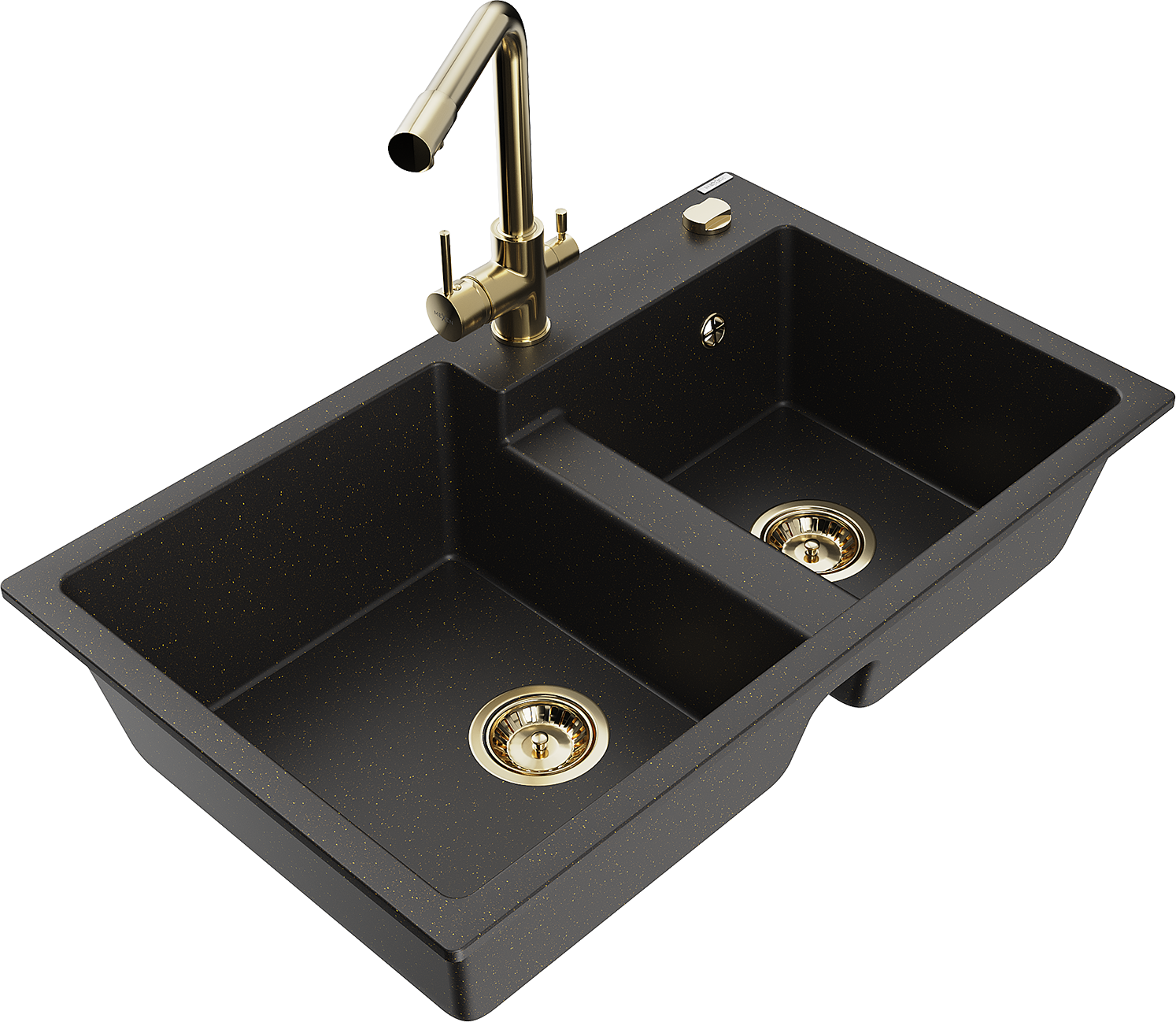 Mexen Tomas granieten spoelbak met 2 kommen en keukenkraan Duero, zwart/goud metallic - 6516-75-671600-50