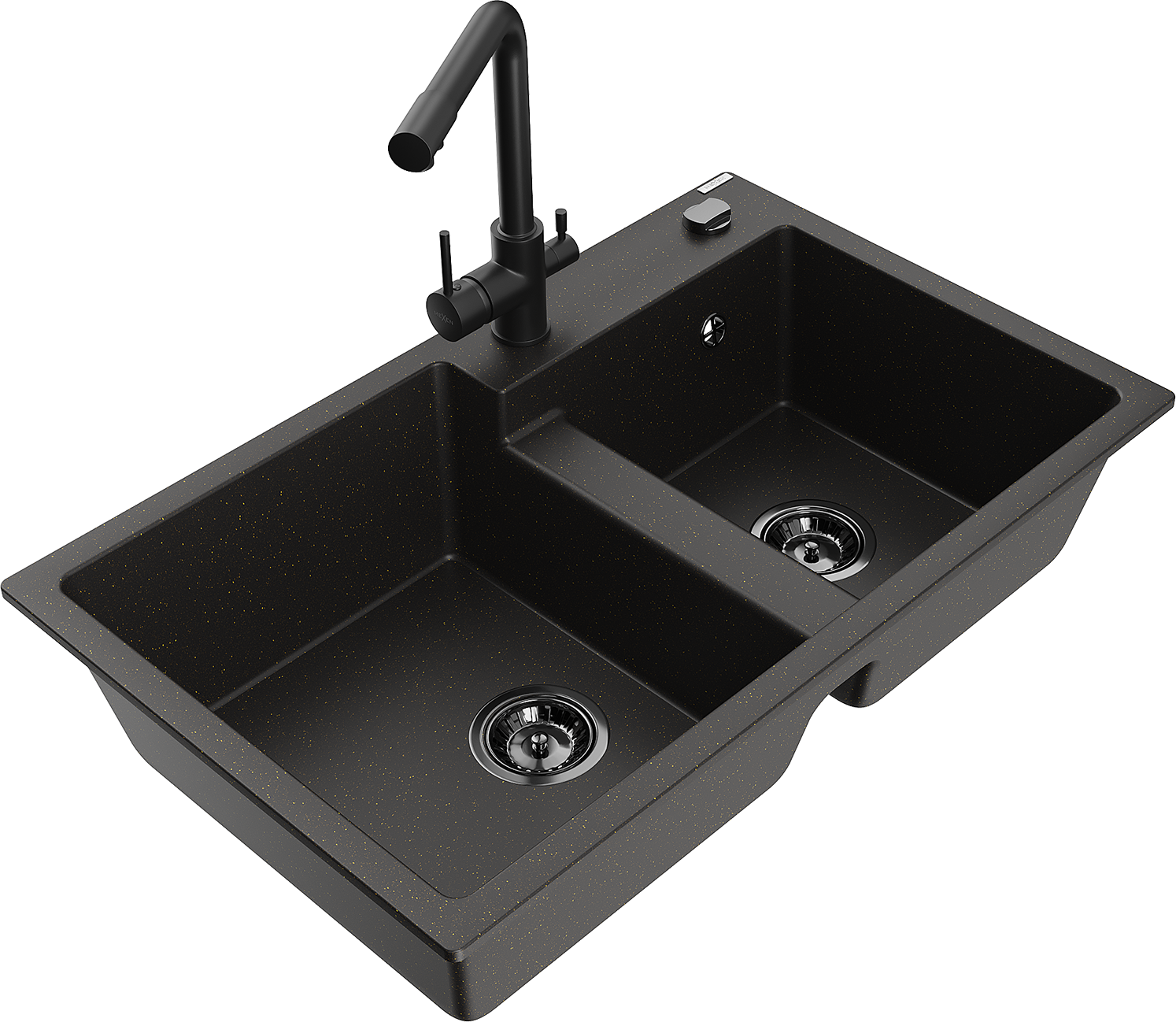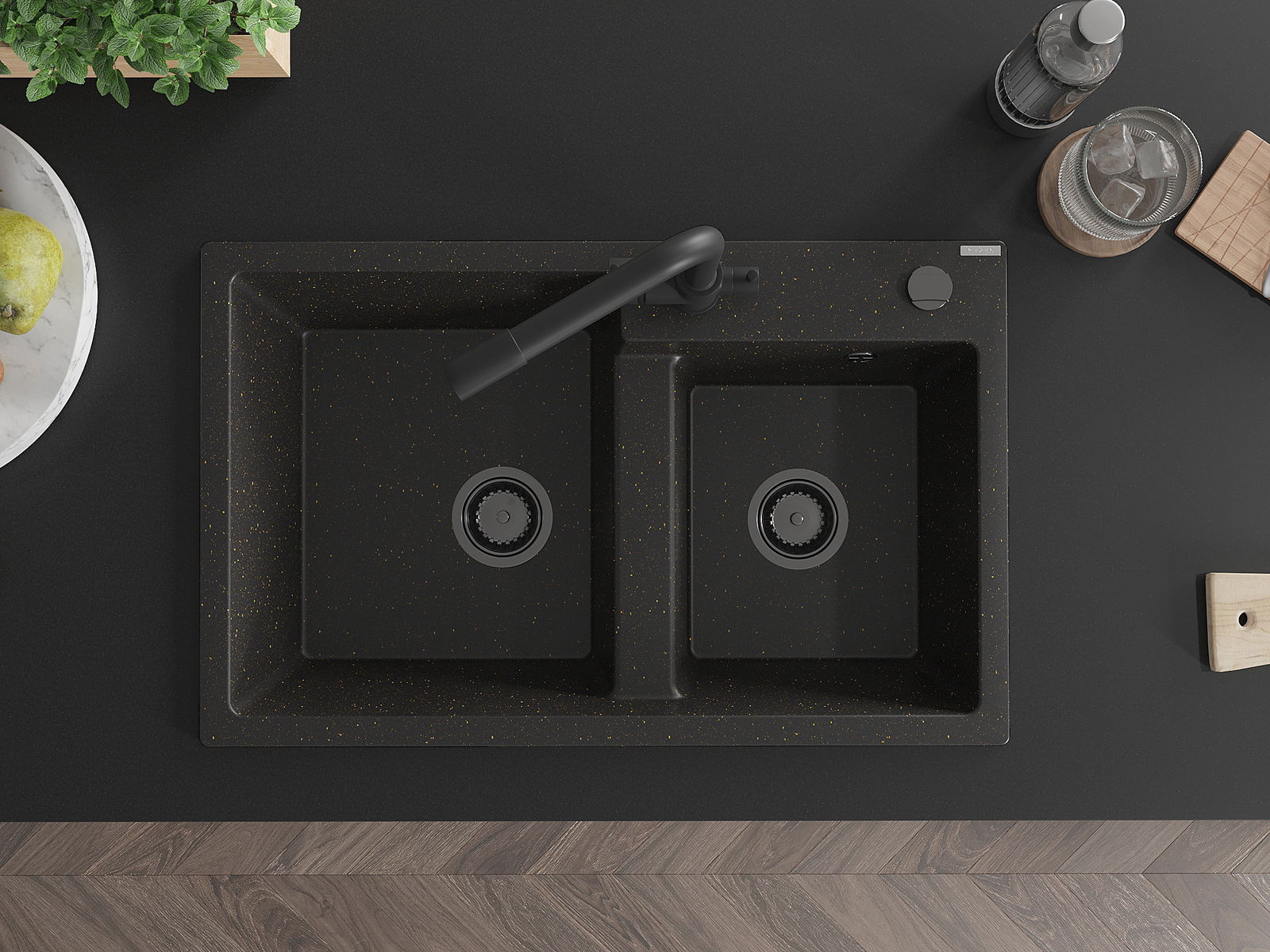Mexen Tomas granieten dubbele spoelbak met keukenmengkraan Duero, zwart/goud metallic - 6516-75-671600-70-B
