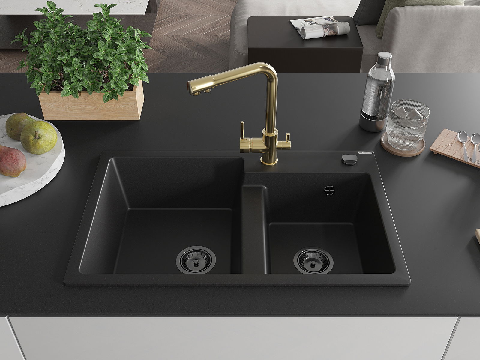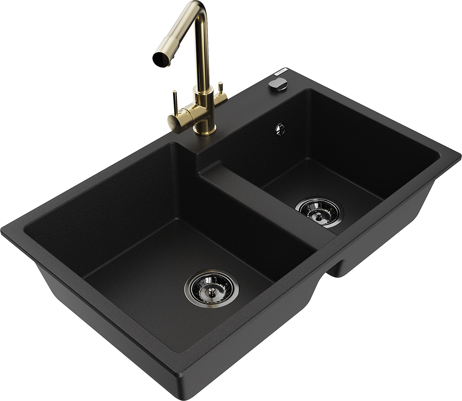 Mexen Tomas granieten spoelbak 2-kamer met keukenmengkraan Duero, zwart - 6516-77-671600-50-B