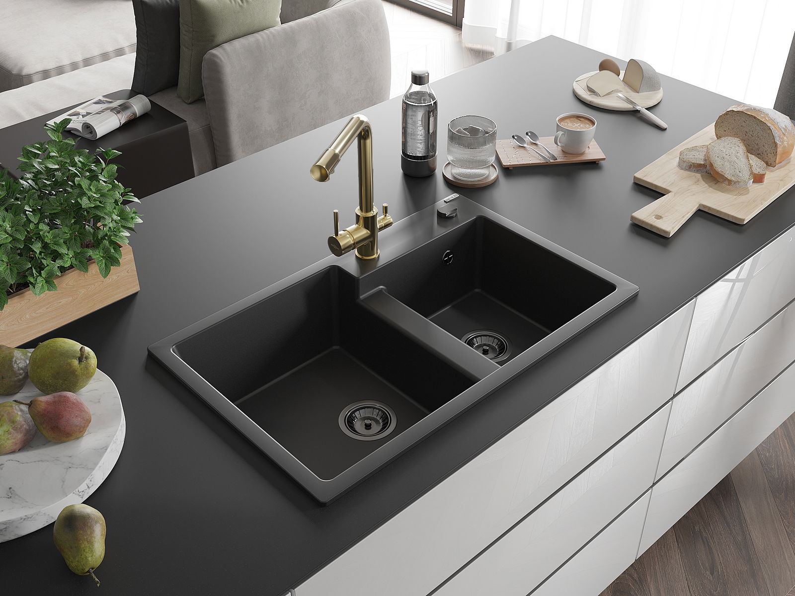 De gootsteen is gemaakt van hoogwaardig graniet. Het vormt een elegante en vooral praktische aanvulling op elke keuken, ongeacht de stijl ervan. De hoge kwaliteit en duurzaamheid van graniet garanderen jarenlang gebruik.