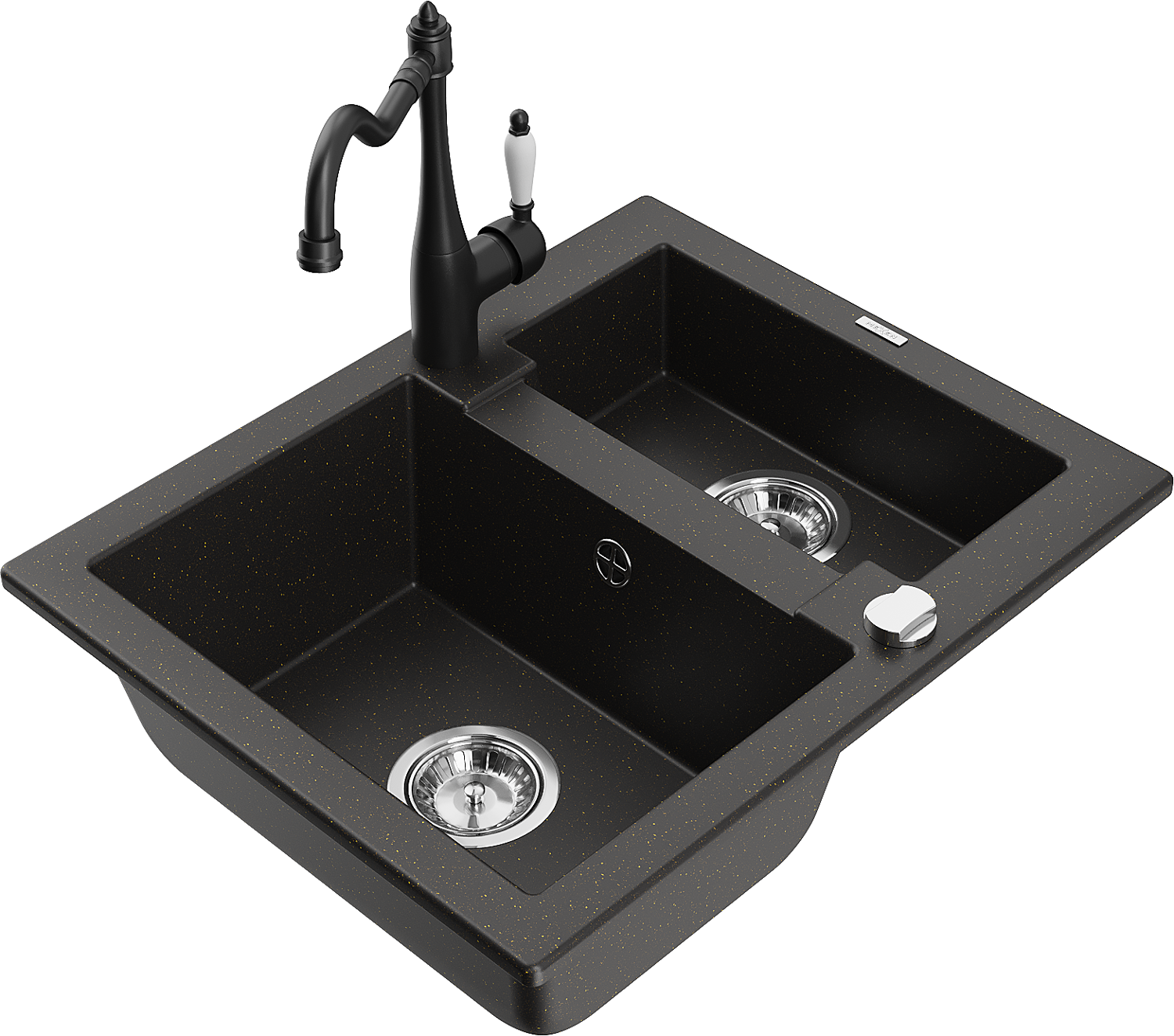 Mexen Carlos granieten gootsteen 1,5-komor met keukenmengkraan Carla, zwart/gouden metallic - 6518-75-670700-70