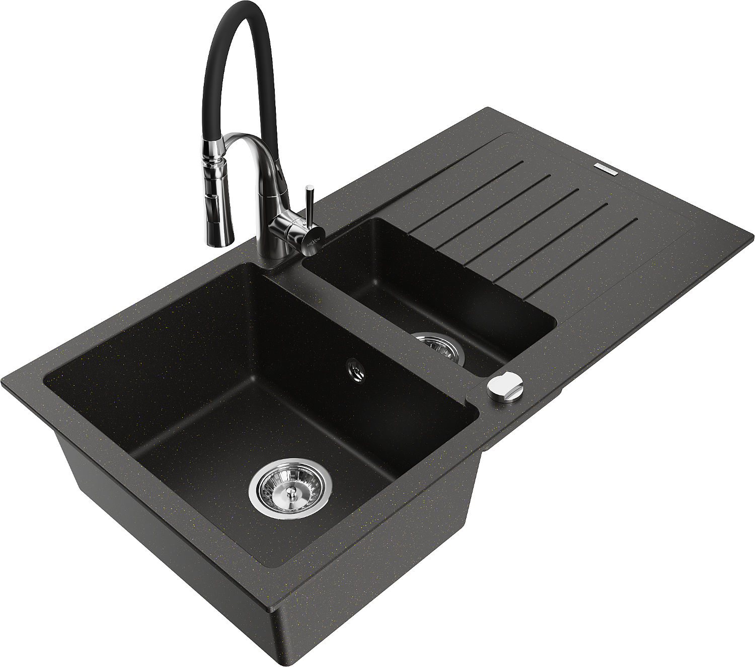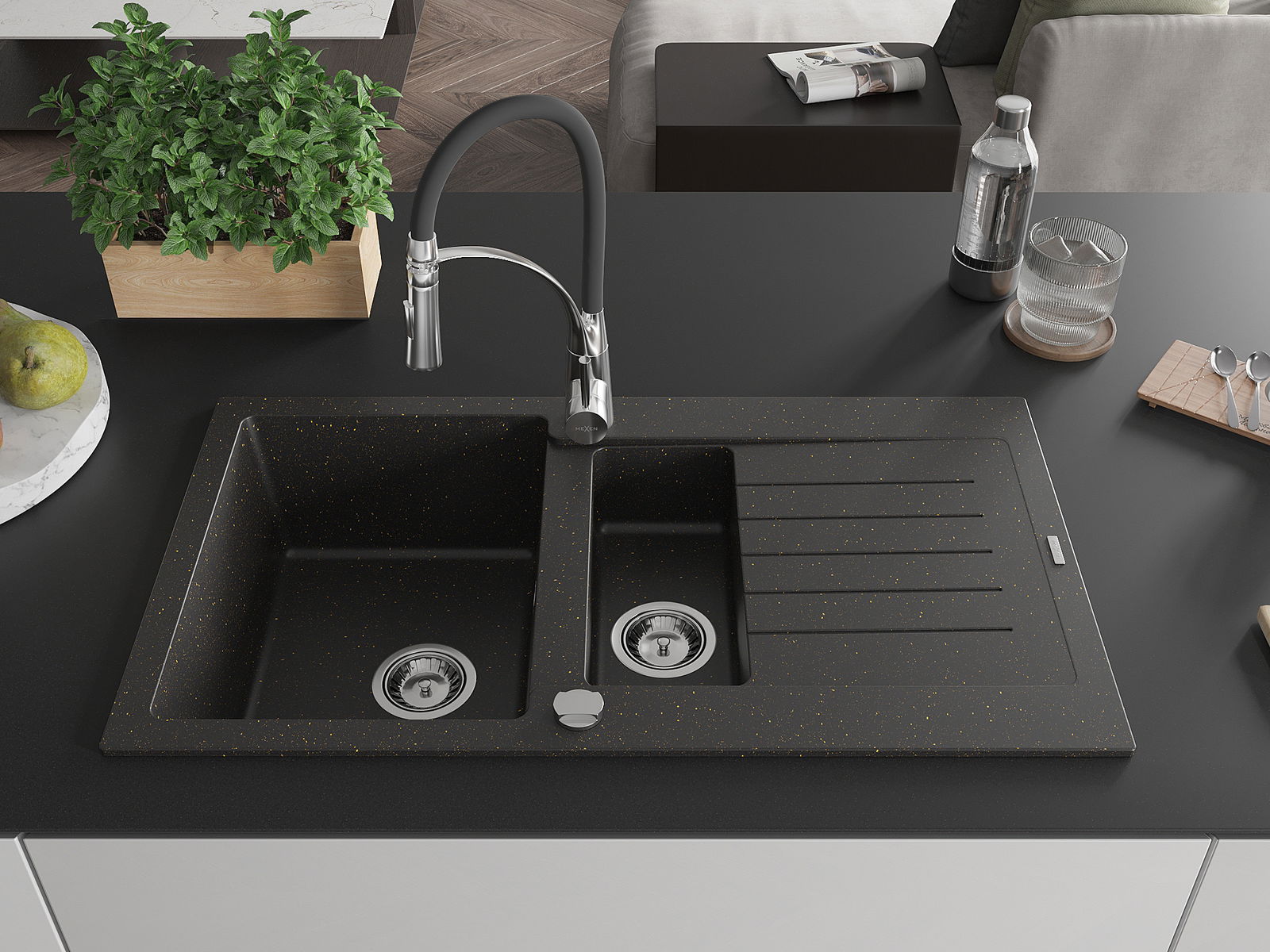 Mexen Matias granieten spoelbak 1,5-baks met afdruiprek en keukenmengkraan Aster, zwart/goud metallic - 6502-75-73450-07