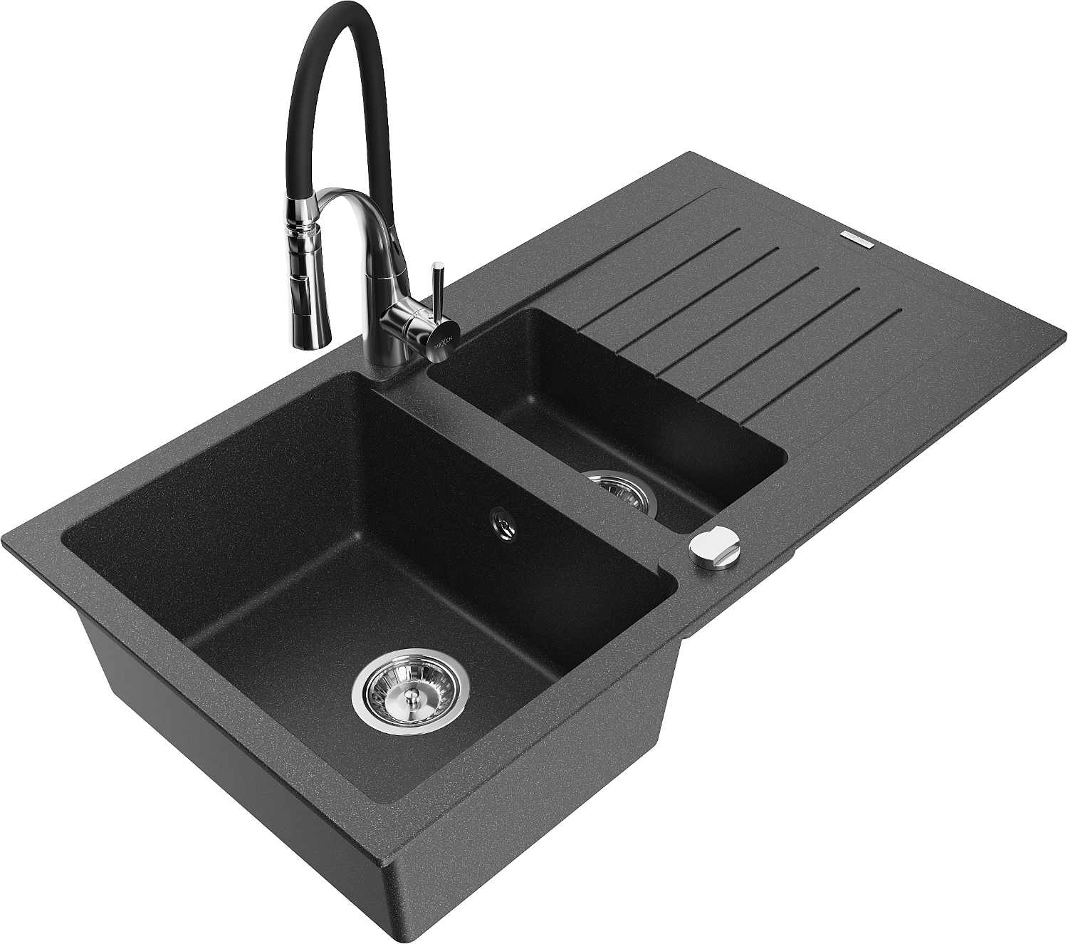 Mexen Matias 1,5-komorige granieten spoelbak met afdruiprek en keukenkraan Aster, zwart gespikkeld - 6502-76-73450-07