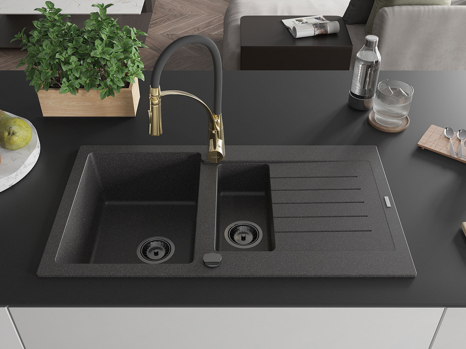 Mexen Matias granieten spoelbak met 1,5 kamers, druiprek en keukenmengkraan Aster, zwart gespikkeld - 6502-76-73450-57-B