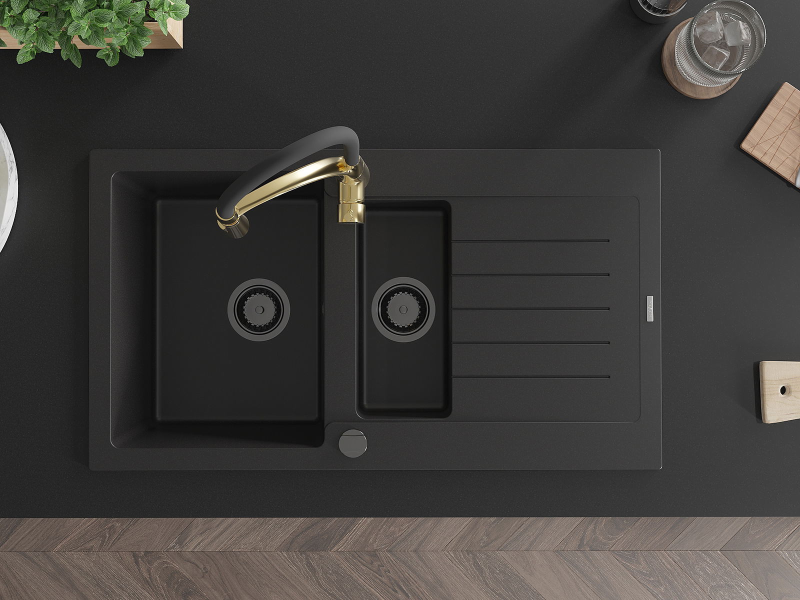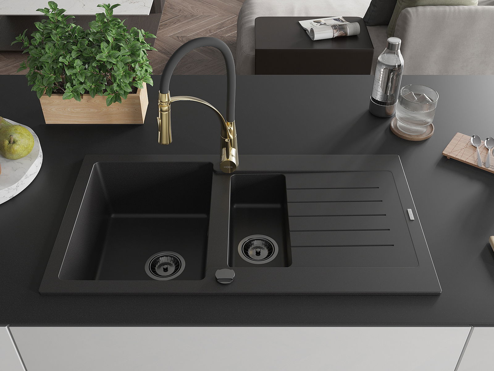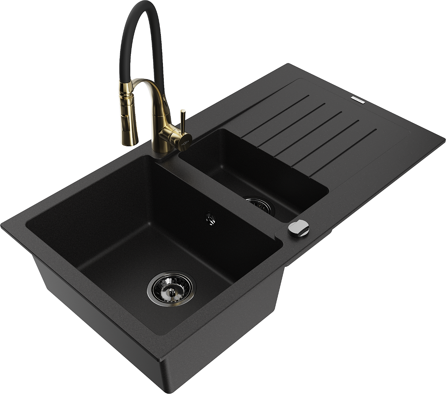 Mexen Matias granieten spoelbak, 1,5-komorige met afdruiprek en keukenmengkraan Aster, zwart - 6502-77-73450-57-B