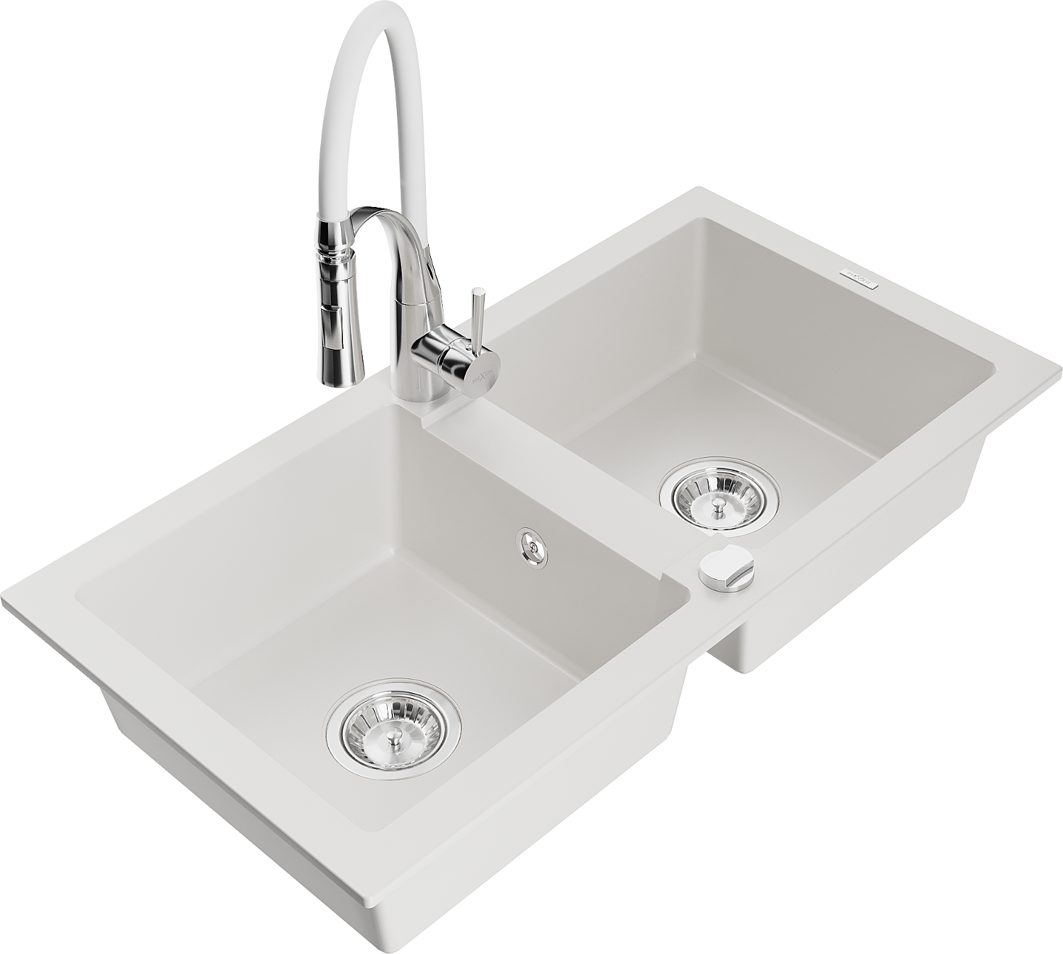 Mexen Mario granieten spoelbak met 2 bakken en keukenmengkraan Aster, wit - 6504-20-73450-02