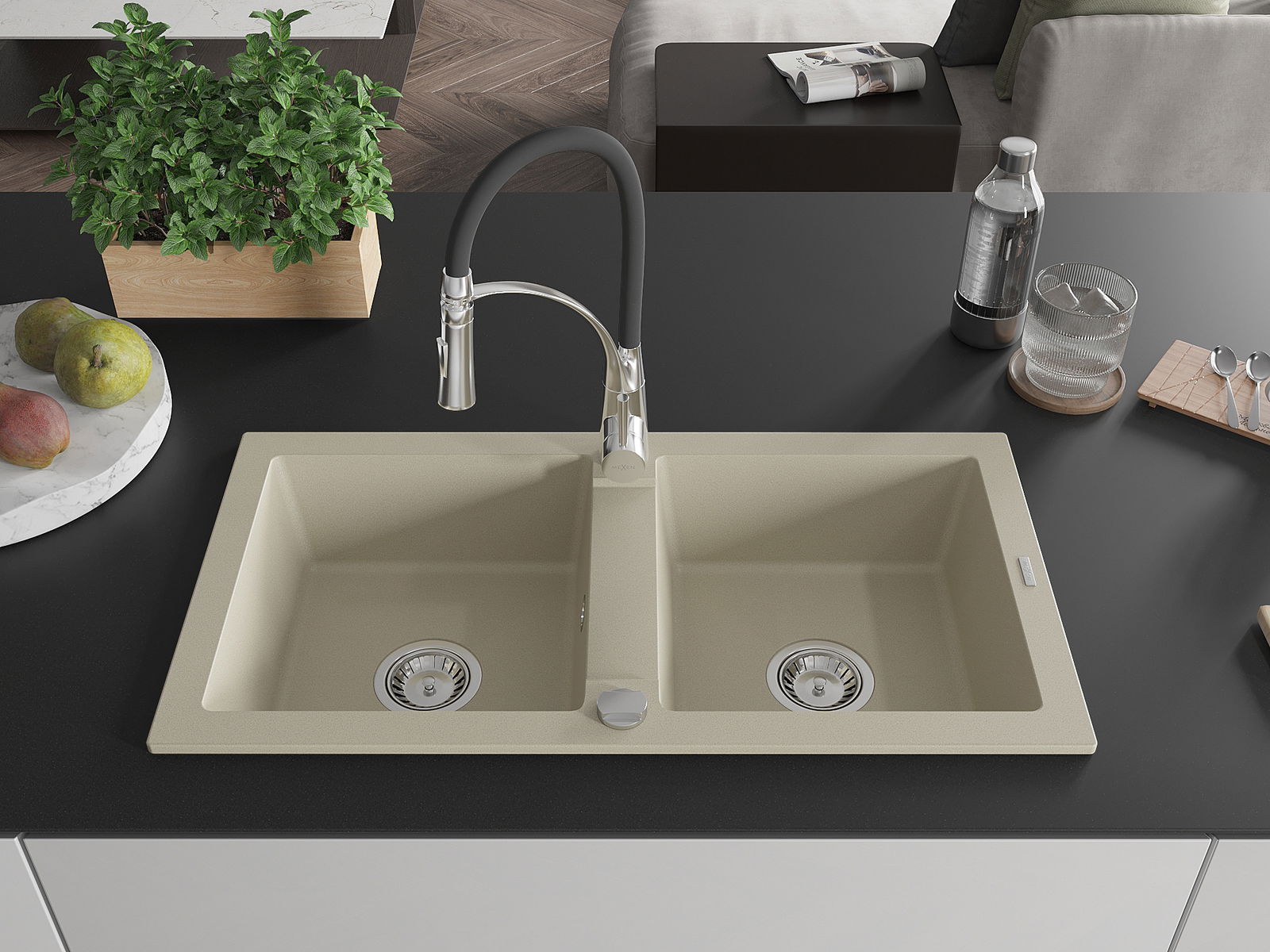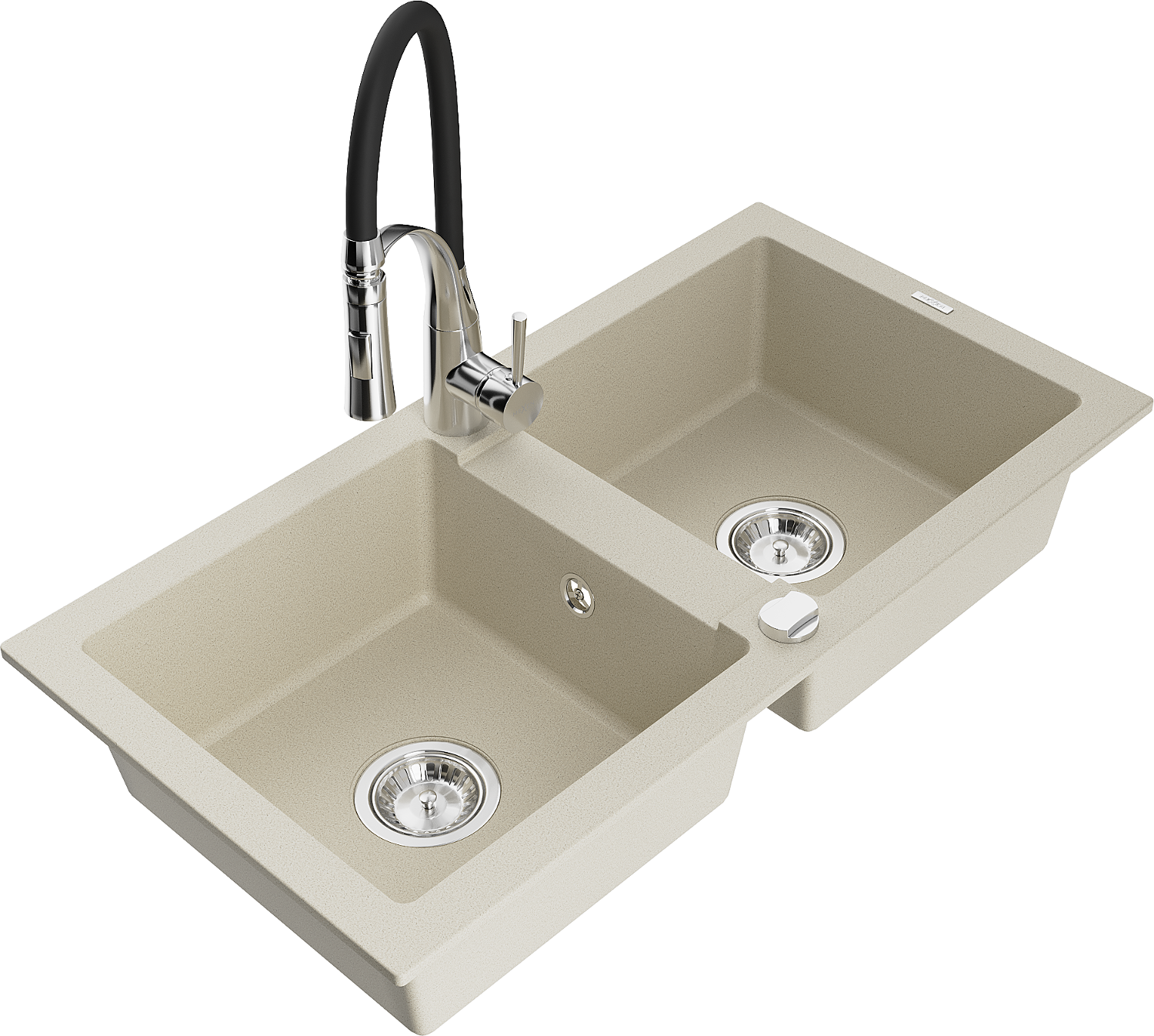Mexen Mario granieten gootsteen 2-kamer met keukenkraan Aster, beige - 6504-69-73450-07