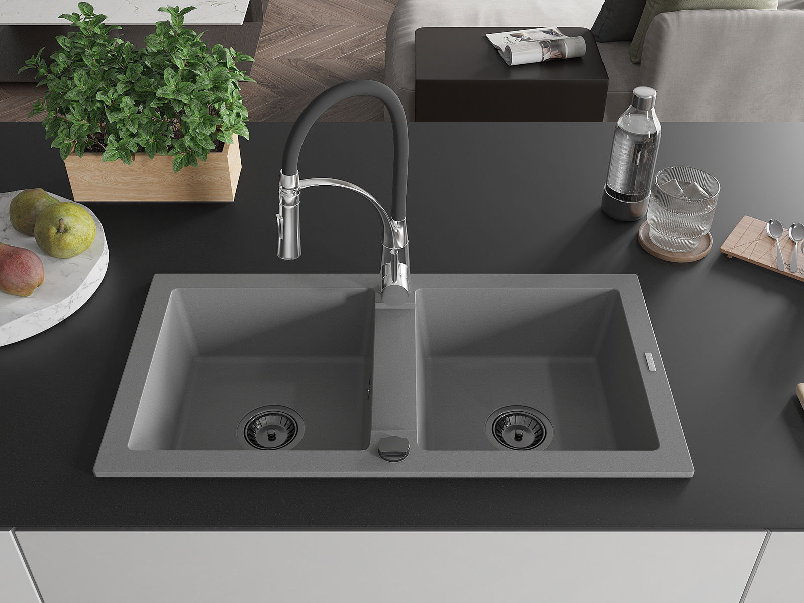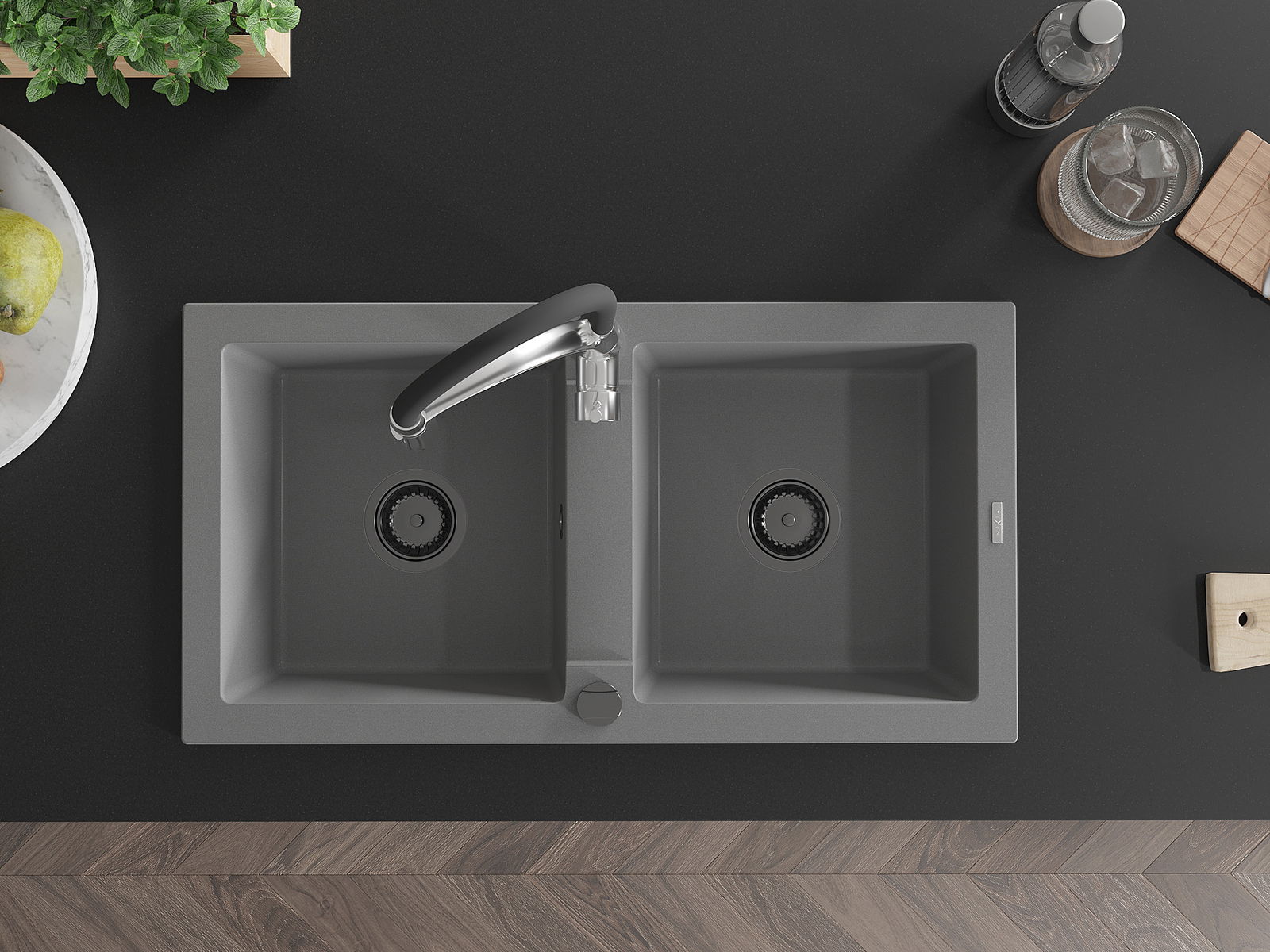 Mexen Mario granieten gootsteen 2-kamer met Aster keukenmengkraan, grijs - 6504-71-73450-07-B
