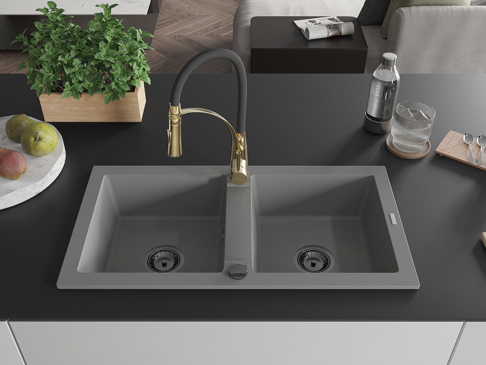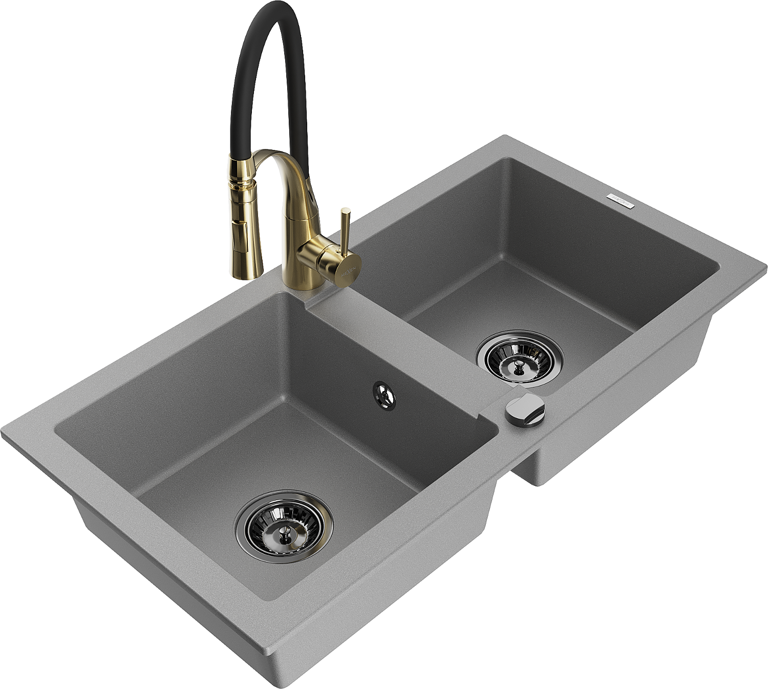 Mexen Mario granieten gootsteen met 2 kamers en keukenmengkraan Aster, grijs - 6504-71-73450-57-B