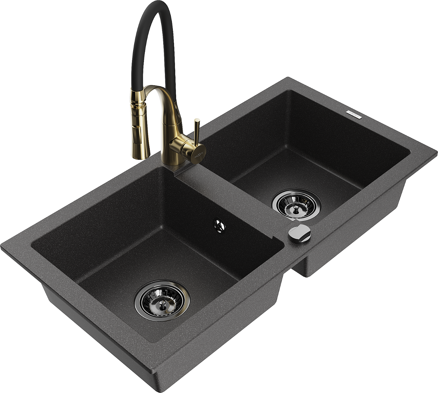 Mexen Mario granieten gootsteen met 2 kommen en Aster keukenkraan, zwart gespikkeld - 6504-76-73450-57-B