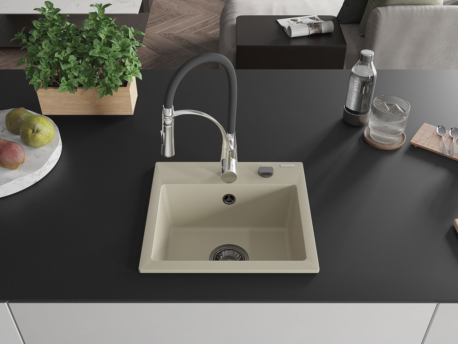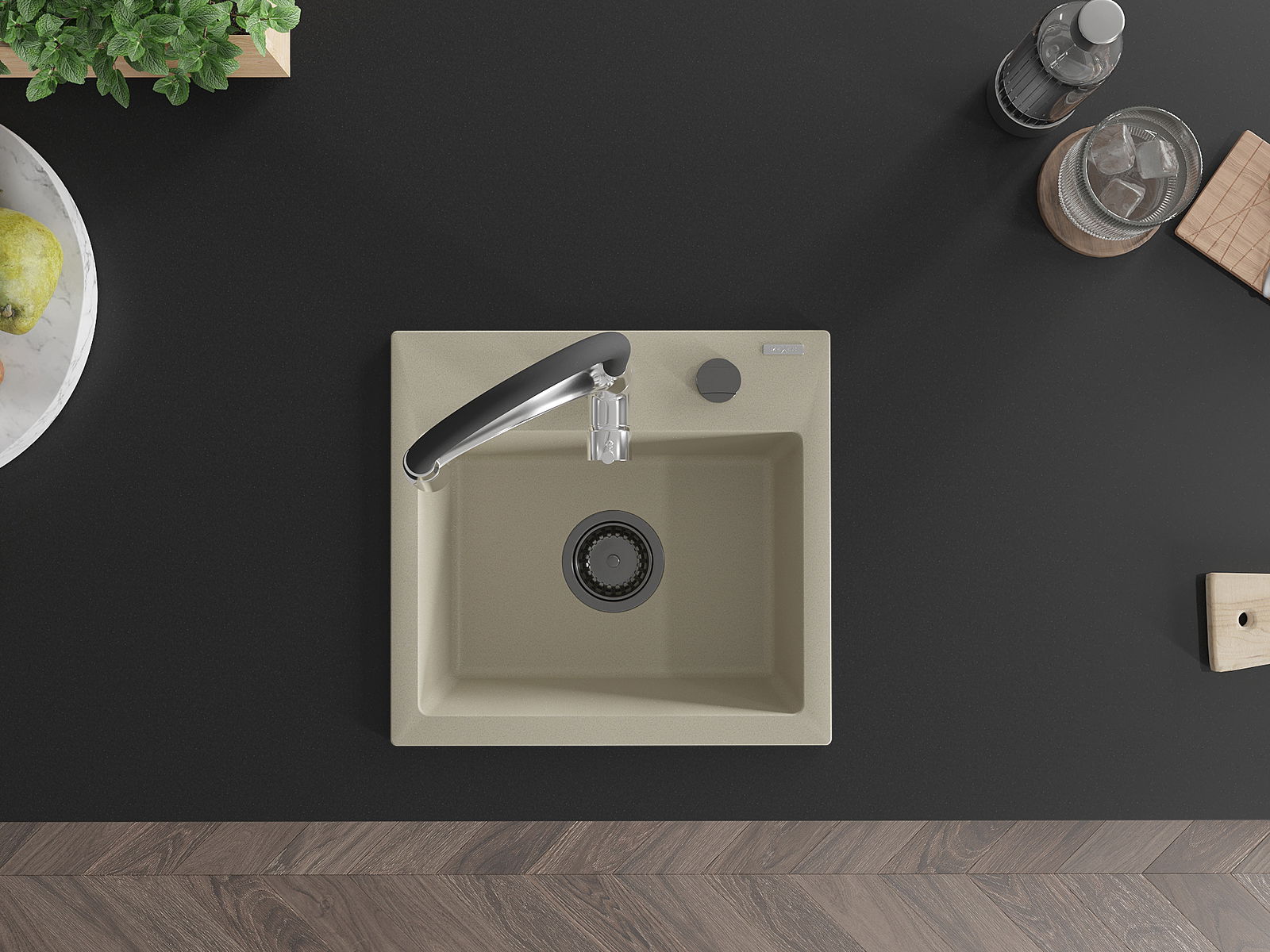 De gootsteen is gemaakt van hoogwaardig graniet. Het vormt een elegante en vooral praktische aanvulling op elke keuken, ongeacht de stijl ervan. De hoge kwaliteit en duurzaamheid van graniet garanderen jarenlang gebruik.