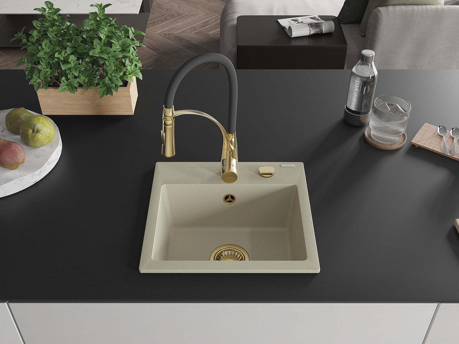 Mexen Milo granieten spoelbak 1-kommer met keukenmengkraan Aster, beige - 6505-69-73450-57-G