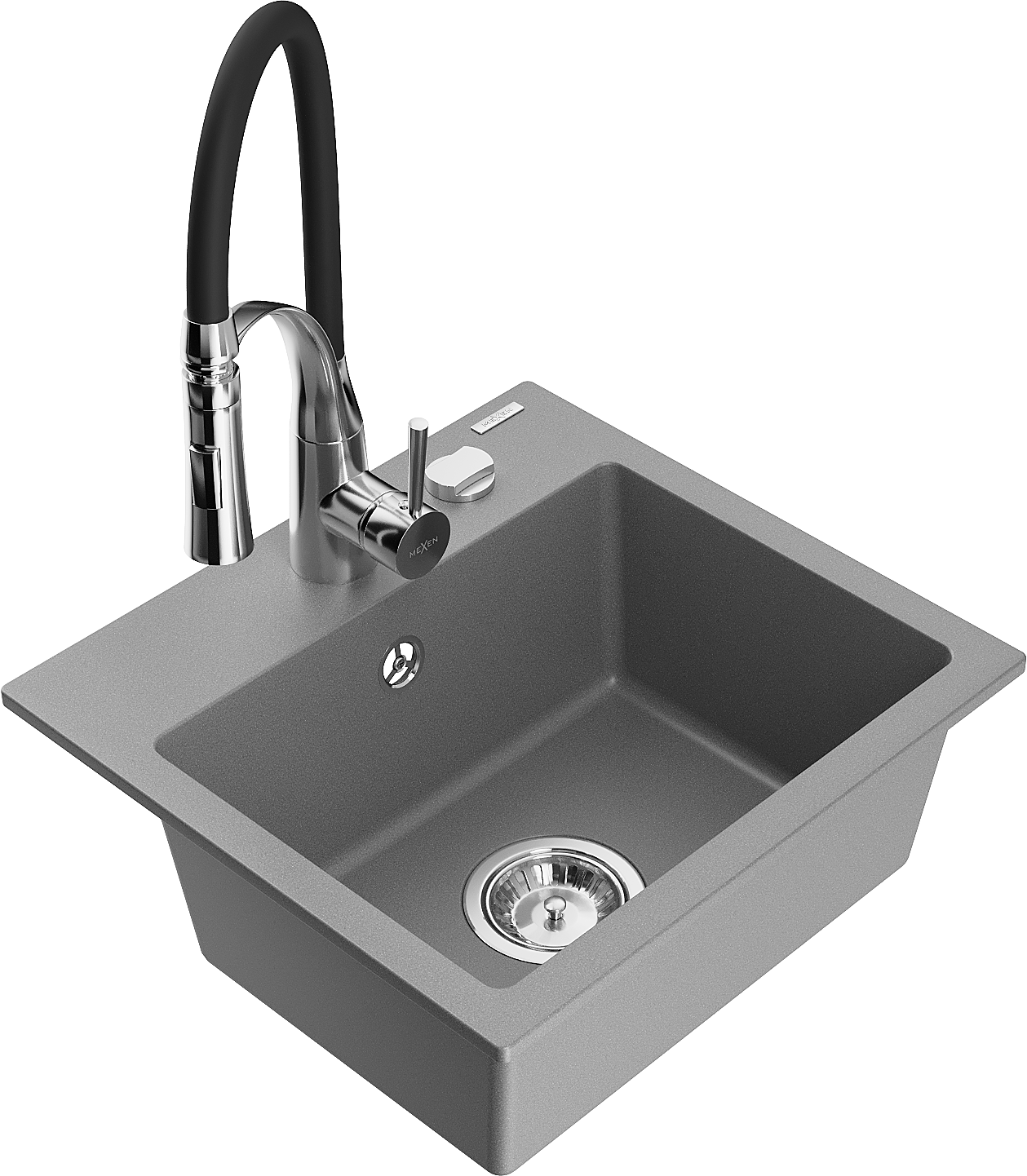 Mexen Milo granieten gootsteen met één kom en keukenmengkraan Aster, grijs - 6505-71-73450-07