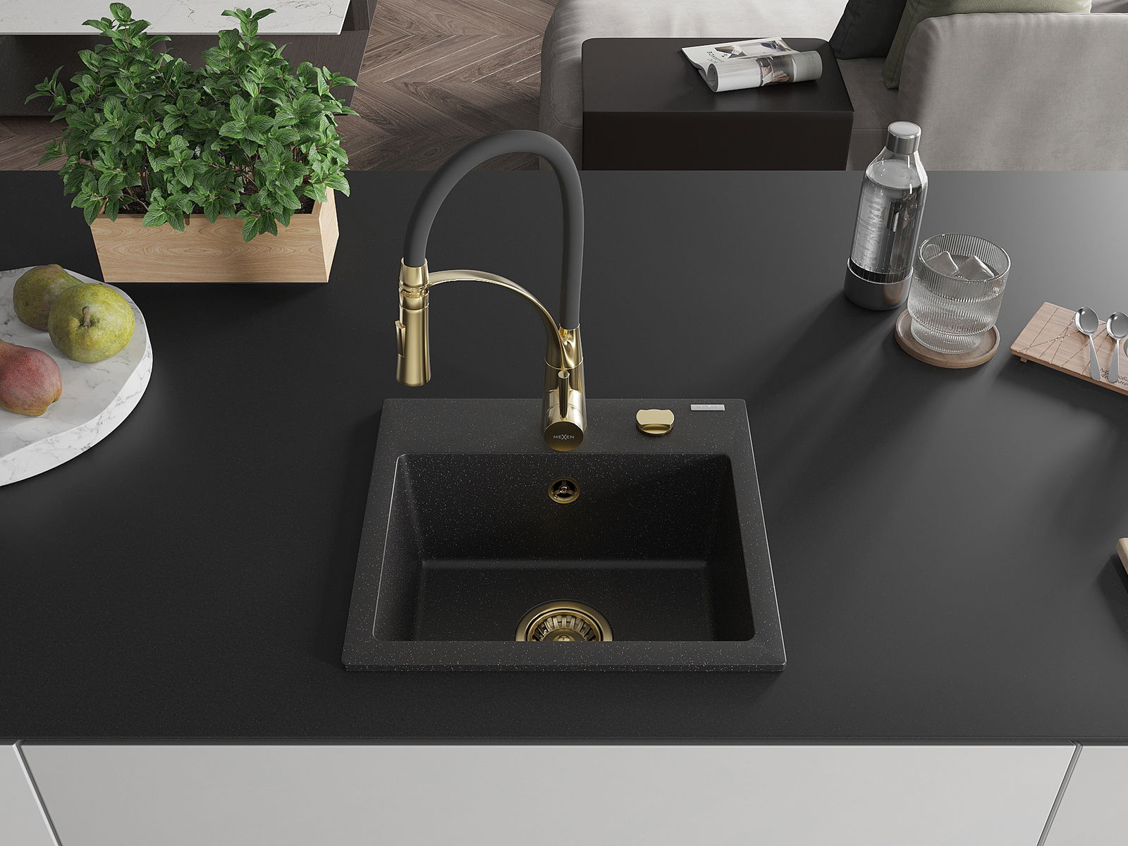 Mexen Milo granieten gootsteen 1-kompartment met keukenmengkraan Aster, zwart/zilvermatallic - 6505-73-73450-57-G