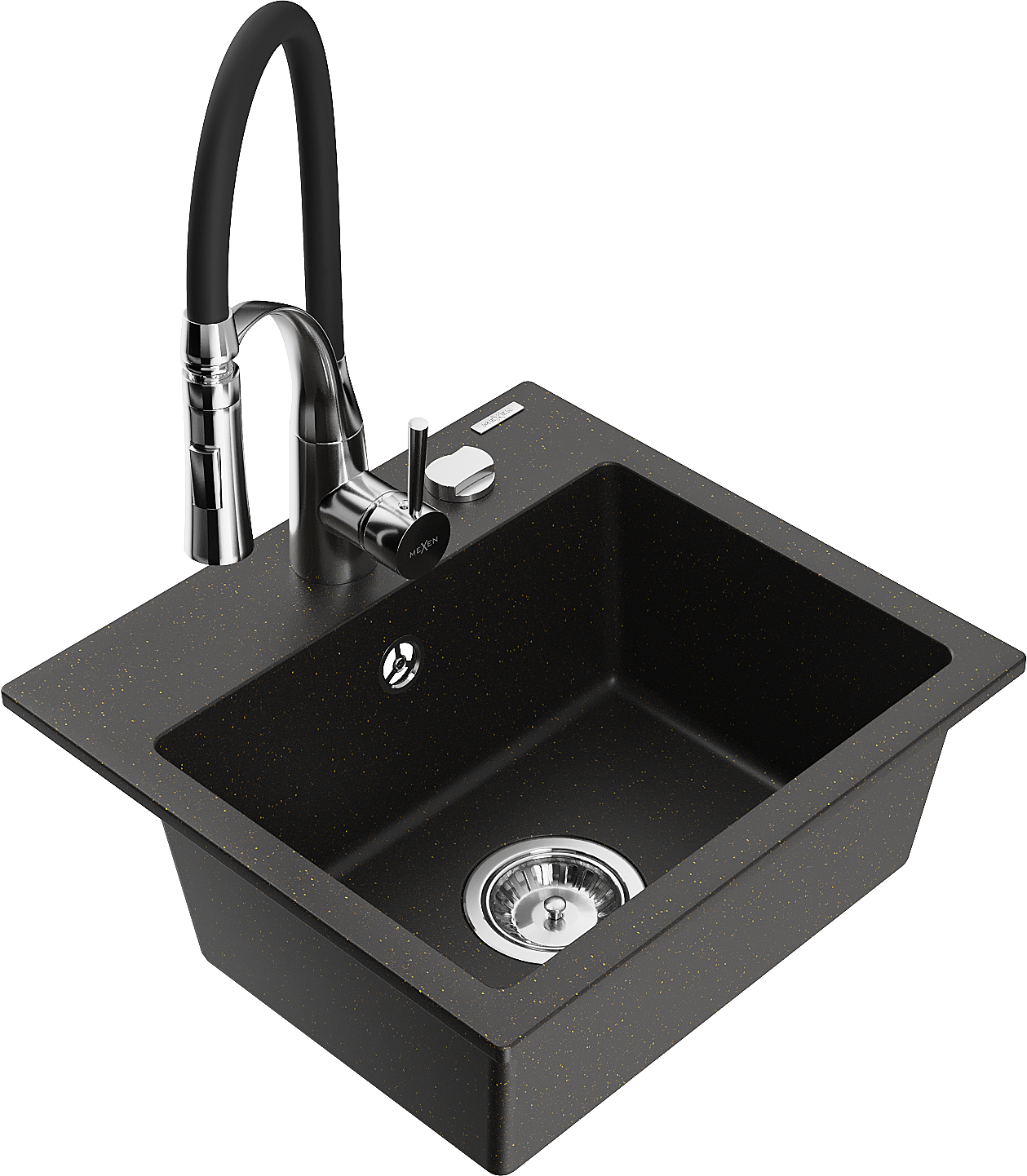 Mexen Milo granieten spoelbak 1-kompartyments met keukenkraan Aster, zwart/gouden metallic - 6505-75-73450-07
