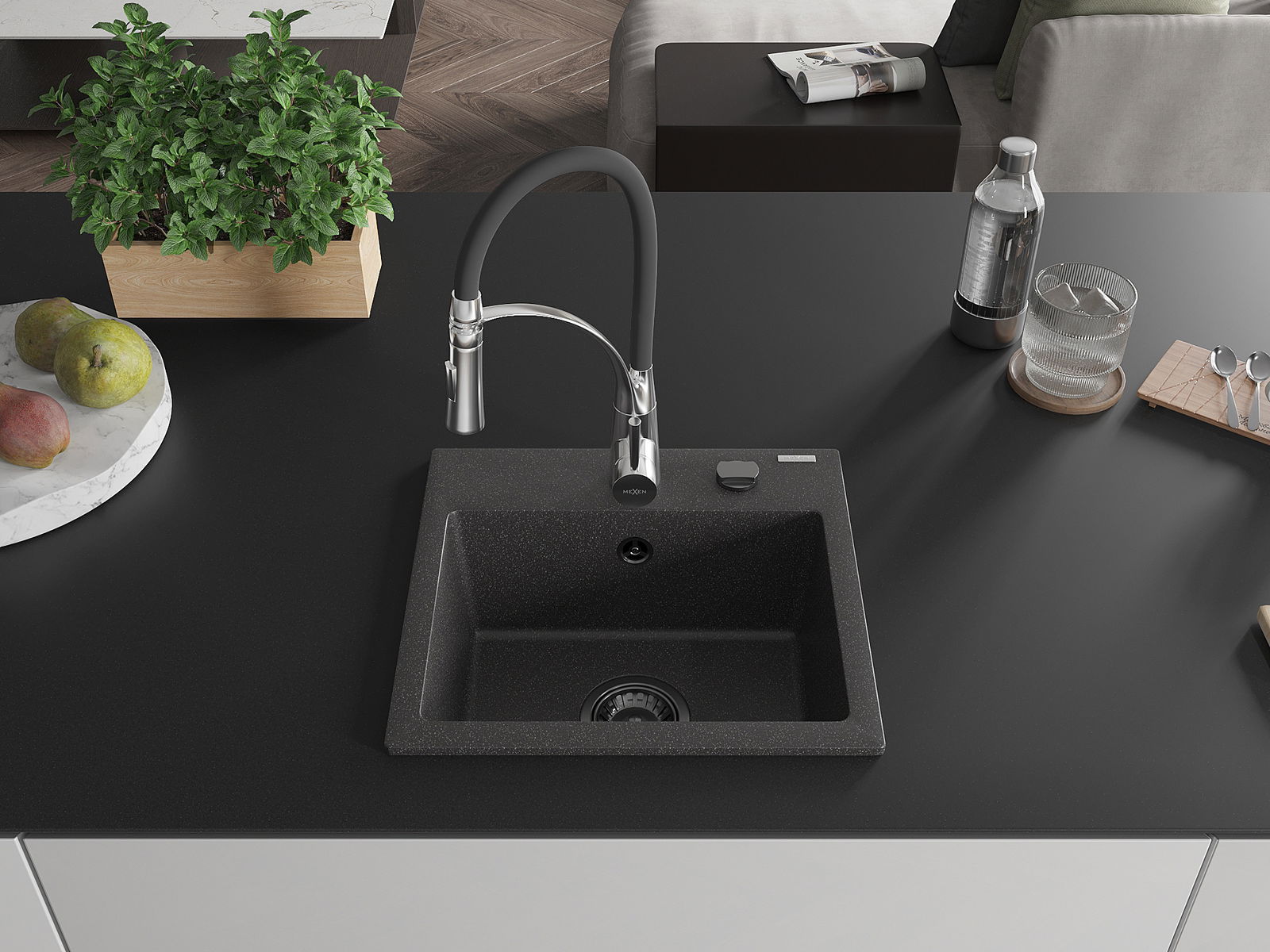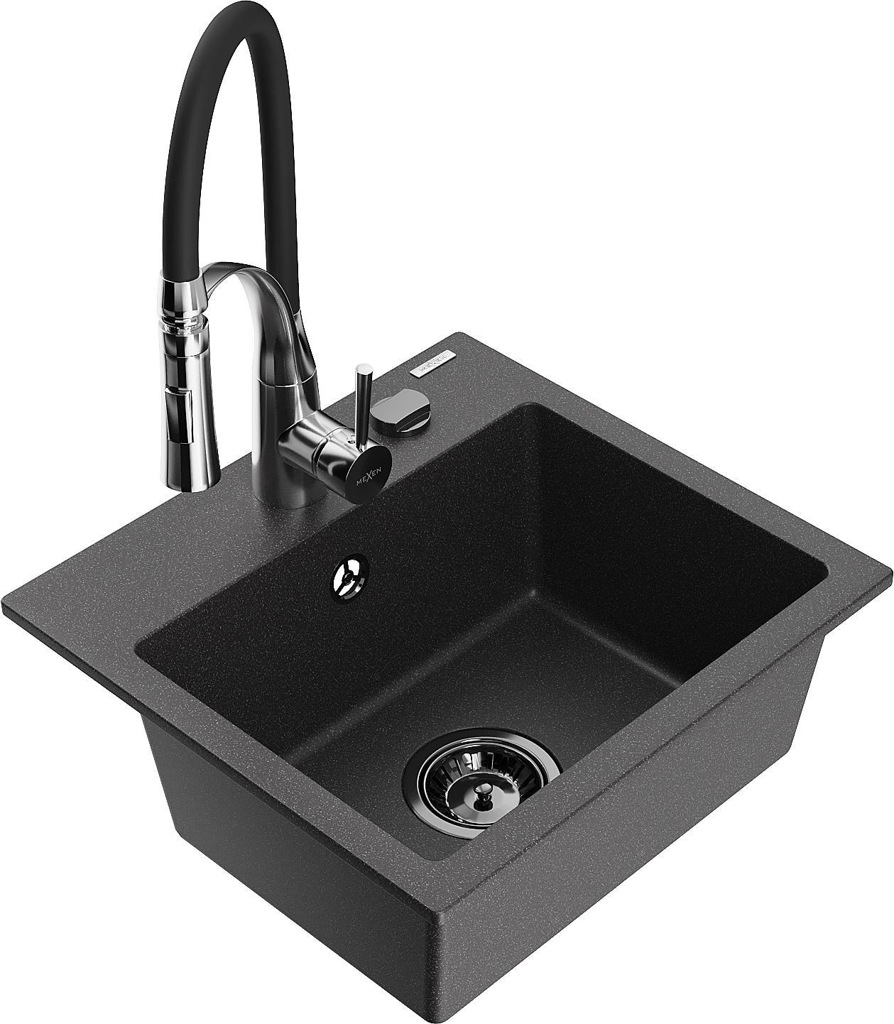 Mexen Milo granieten spoelbak met 1 bak en Aster keukenkraan, zwart gespikkeld - 6505-76-73450-07-B