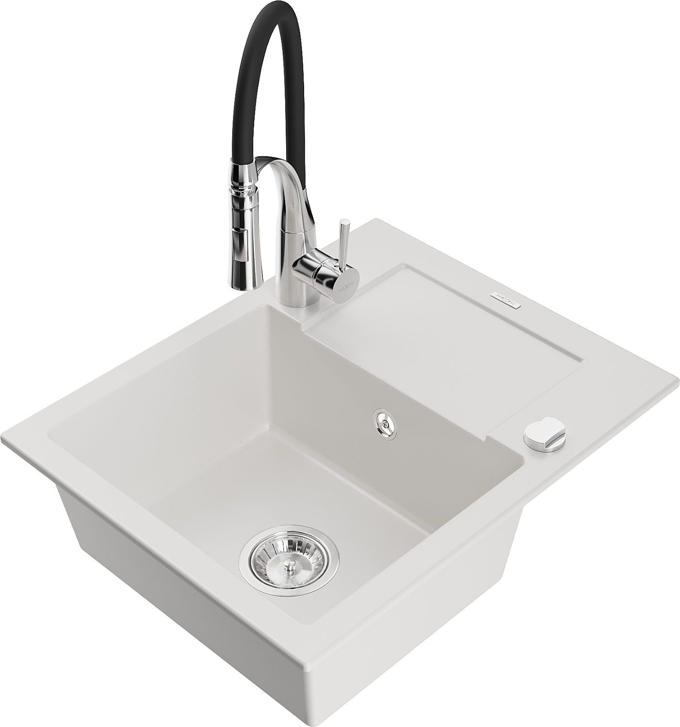 Mexen Enzo granieten gootsteen 1-kompartiment met druiprek en keukenmengkraan Aster, wit - 6506-20-73450-07