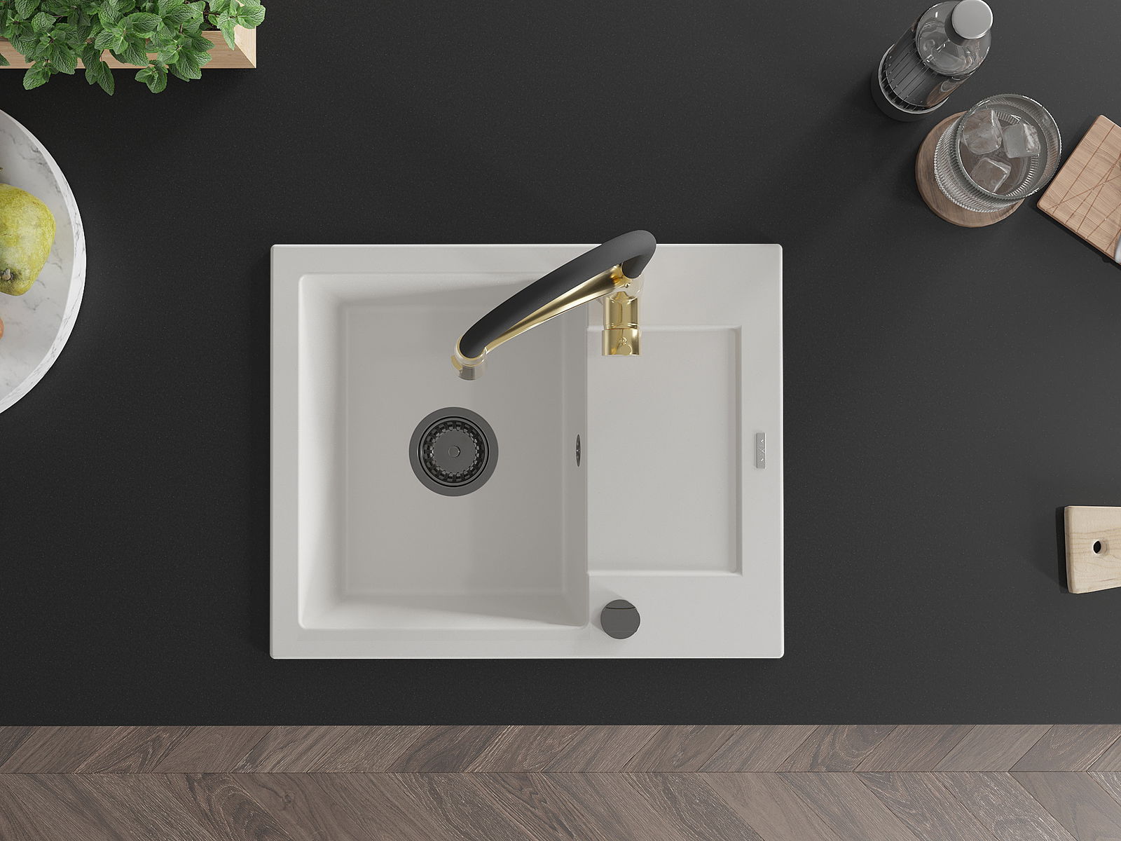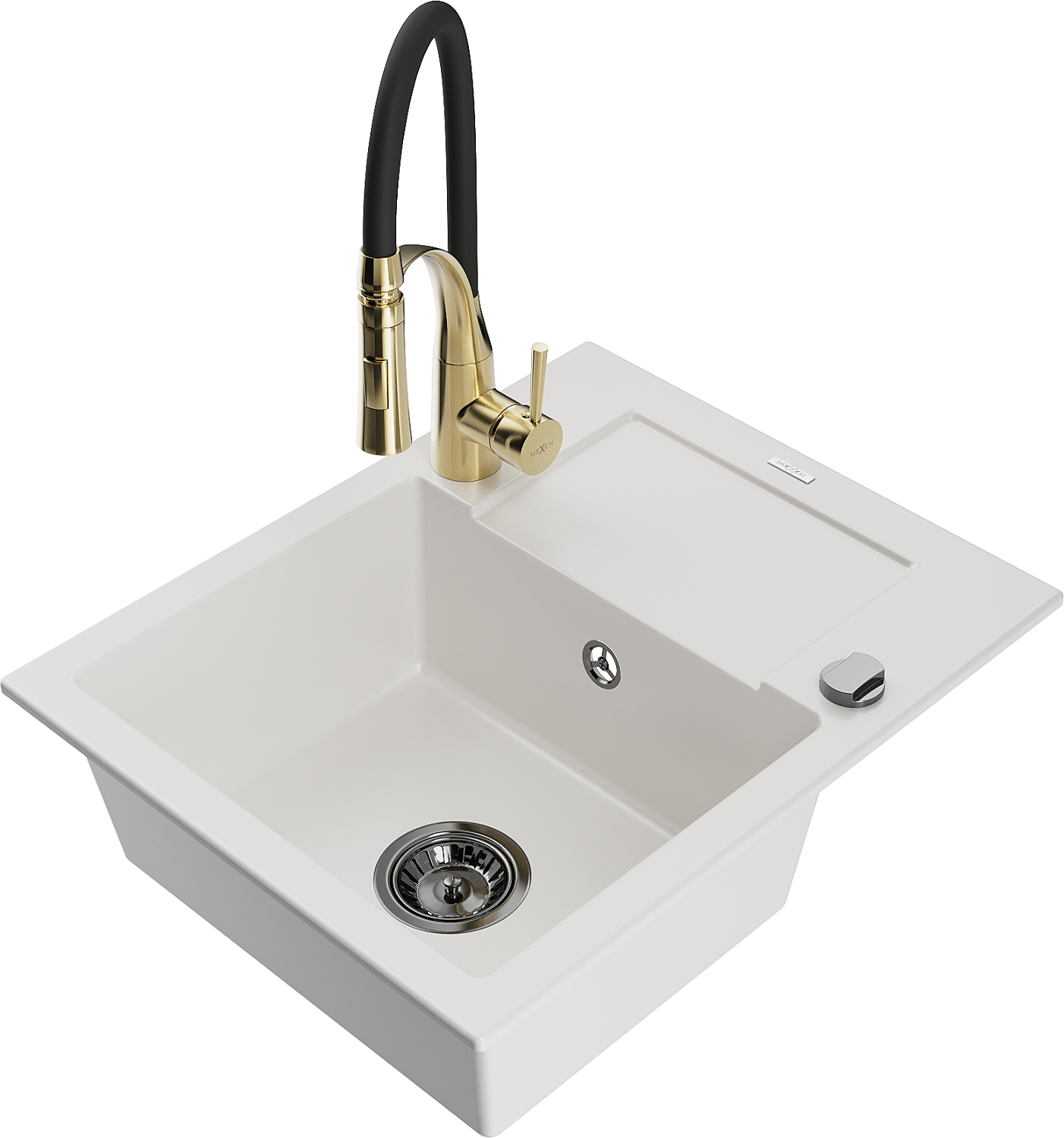 Mexen Enzo granieten spoelbak 1-komers met afdruiprek en keukenmengkraan Aster, wit - 6506-20-73450-57-B