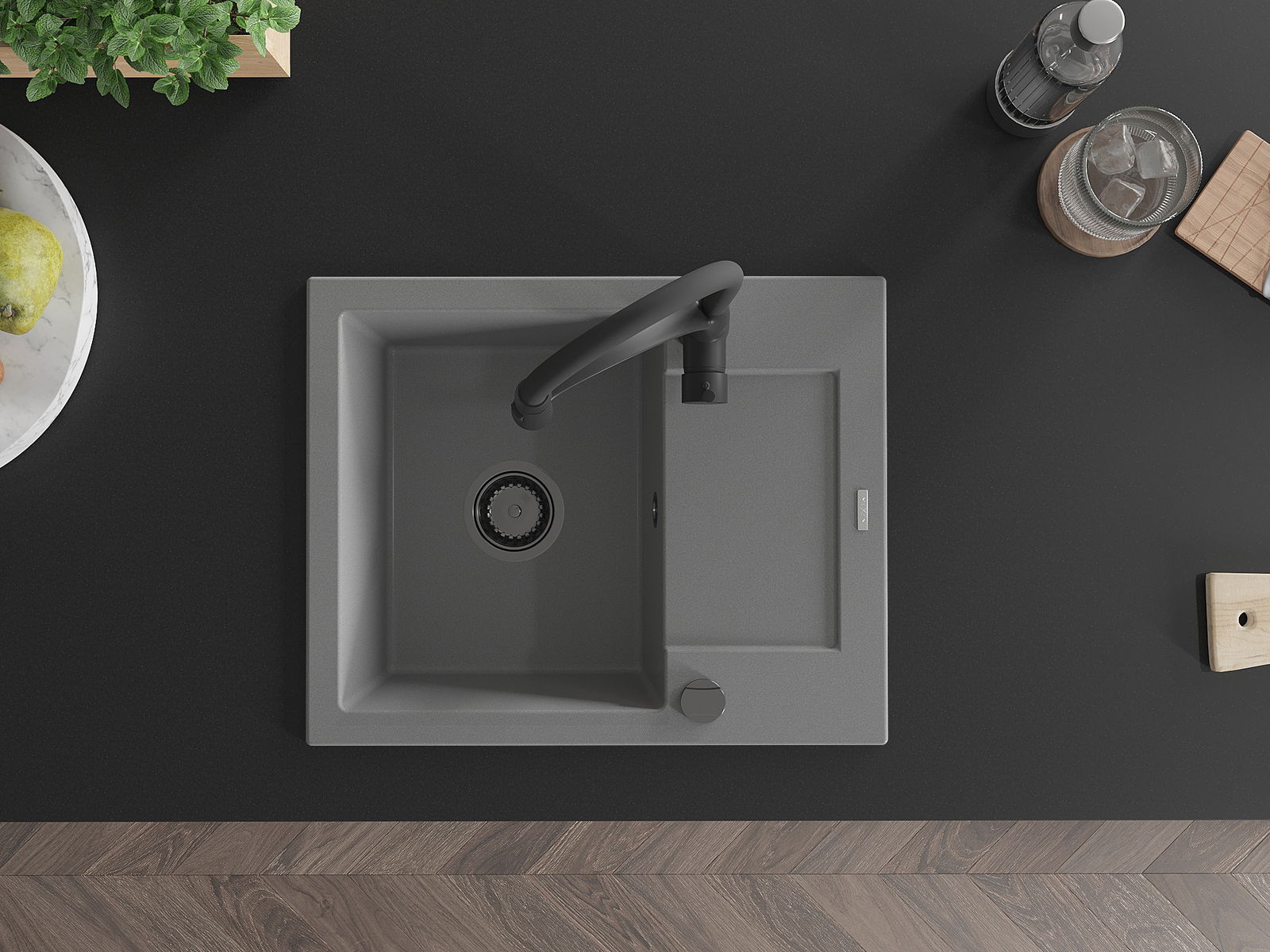 Mexen Enzo granieten gootsteen 1-kompaarts met afdruiprek en keukenmengkraan Aster, grijs - 6506-71-73450-70-B