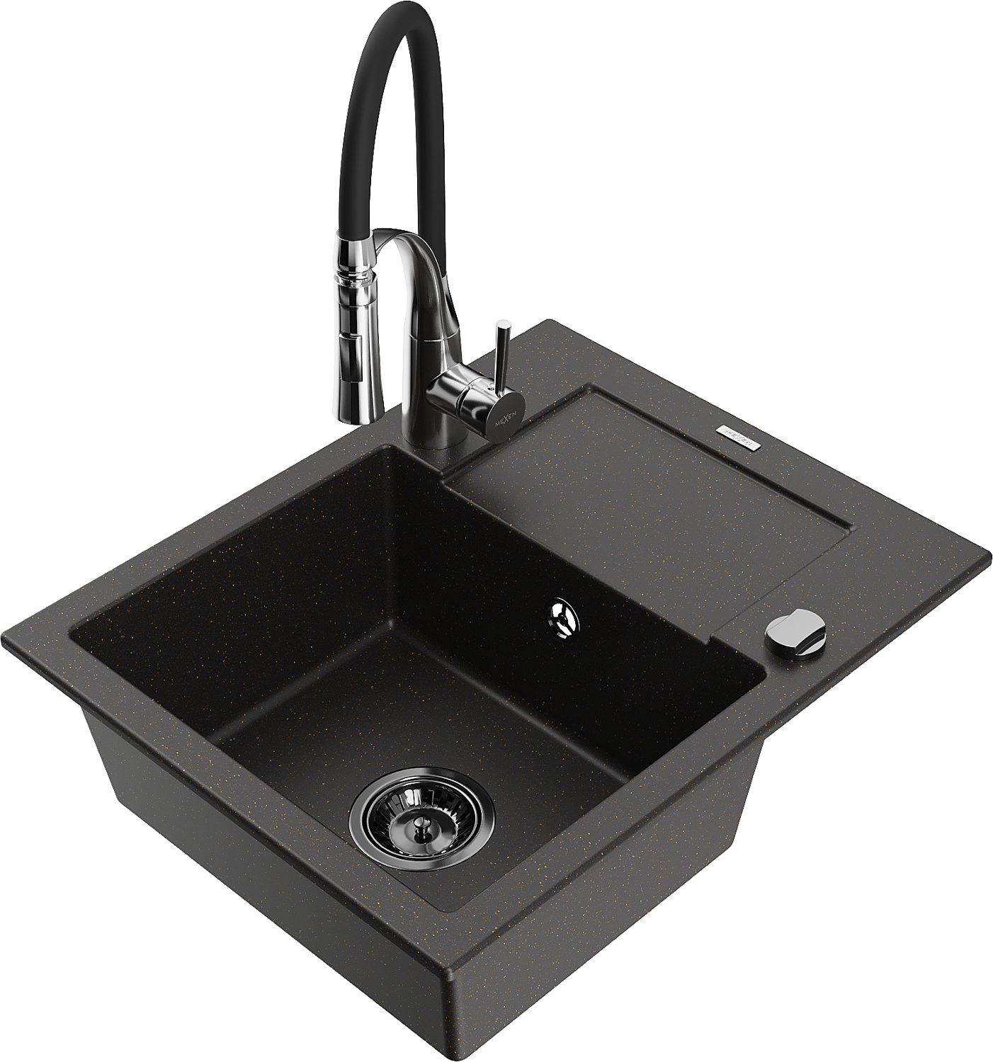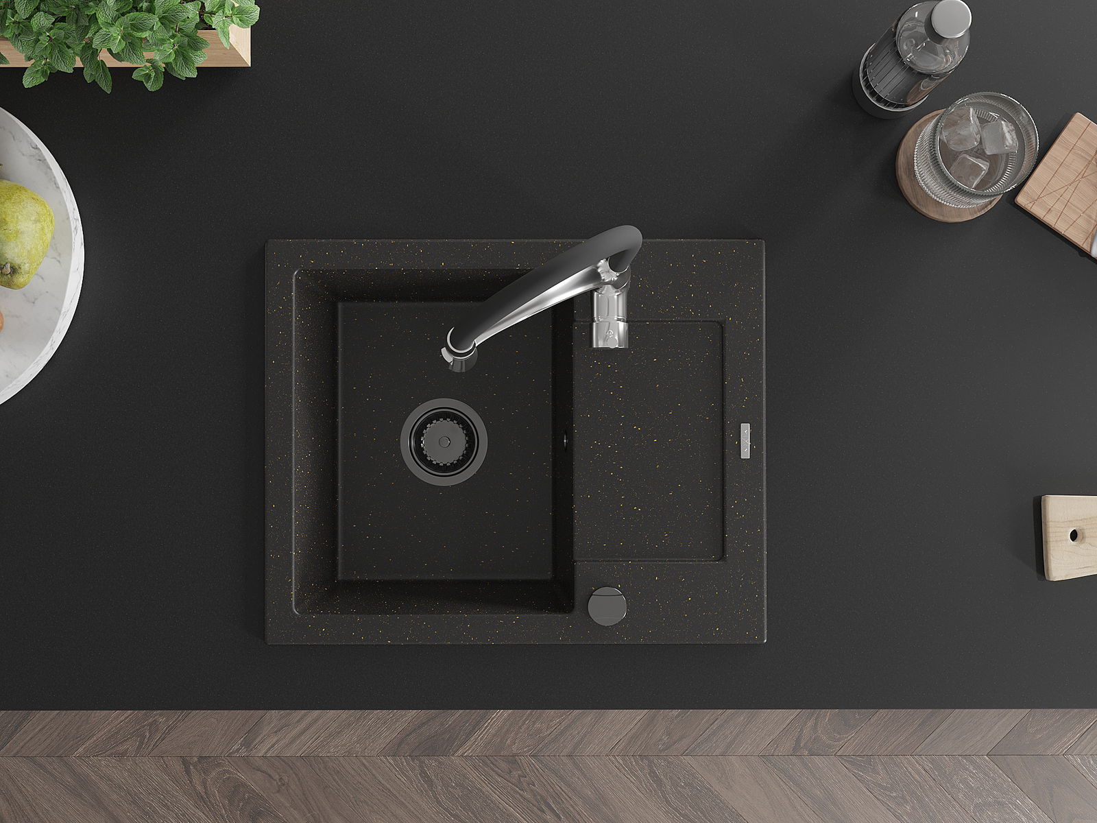 Mexen Enzo granieten gootsteen 1-komor met afdruiprek en keukenmengkraan Aster, zwart/gouden metallic - 6506-75-73450-07-B