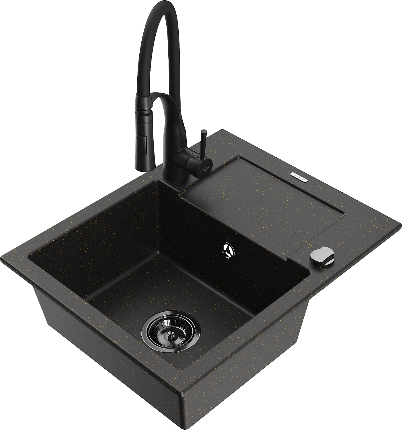 Mexen Enzo granieten spoelbak met 1 kom met afdruiprek en keukenmengkraan Aster, zwart/goud metallic - 6506-75-73450-70-B