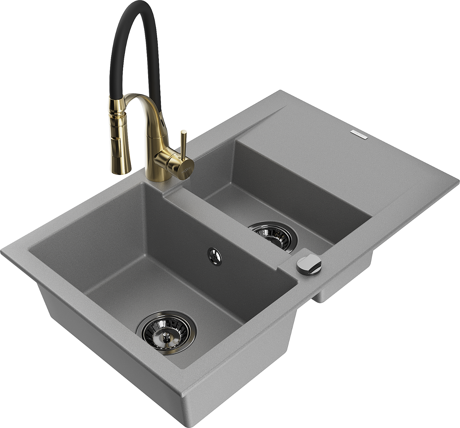 Mexen Gaspar granieten gootsteen 1,5-komervormig met afdruiprek en keukenkraan Aster, grijs - 6507-71-73450-57-B