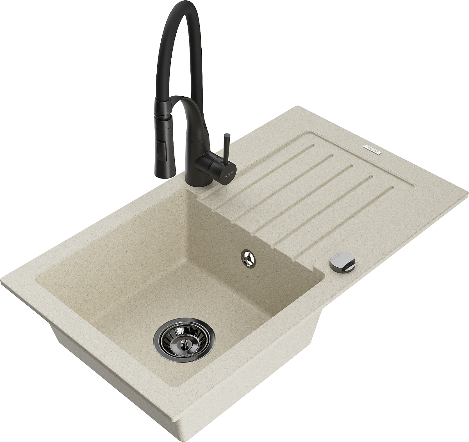 Mexen Pablo granieten spoelbak 1-kompartment met afdruiprek en keukenmengkraan Aster, beige - 6510-69-73450-70-B