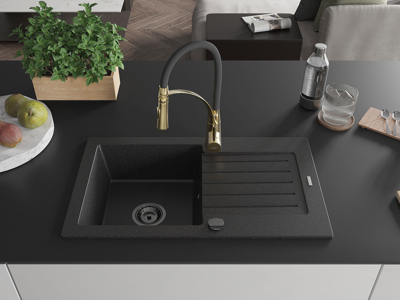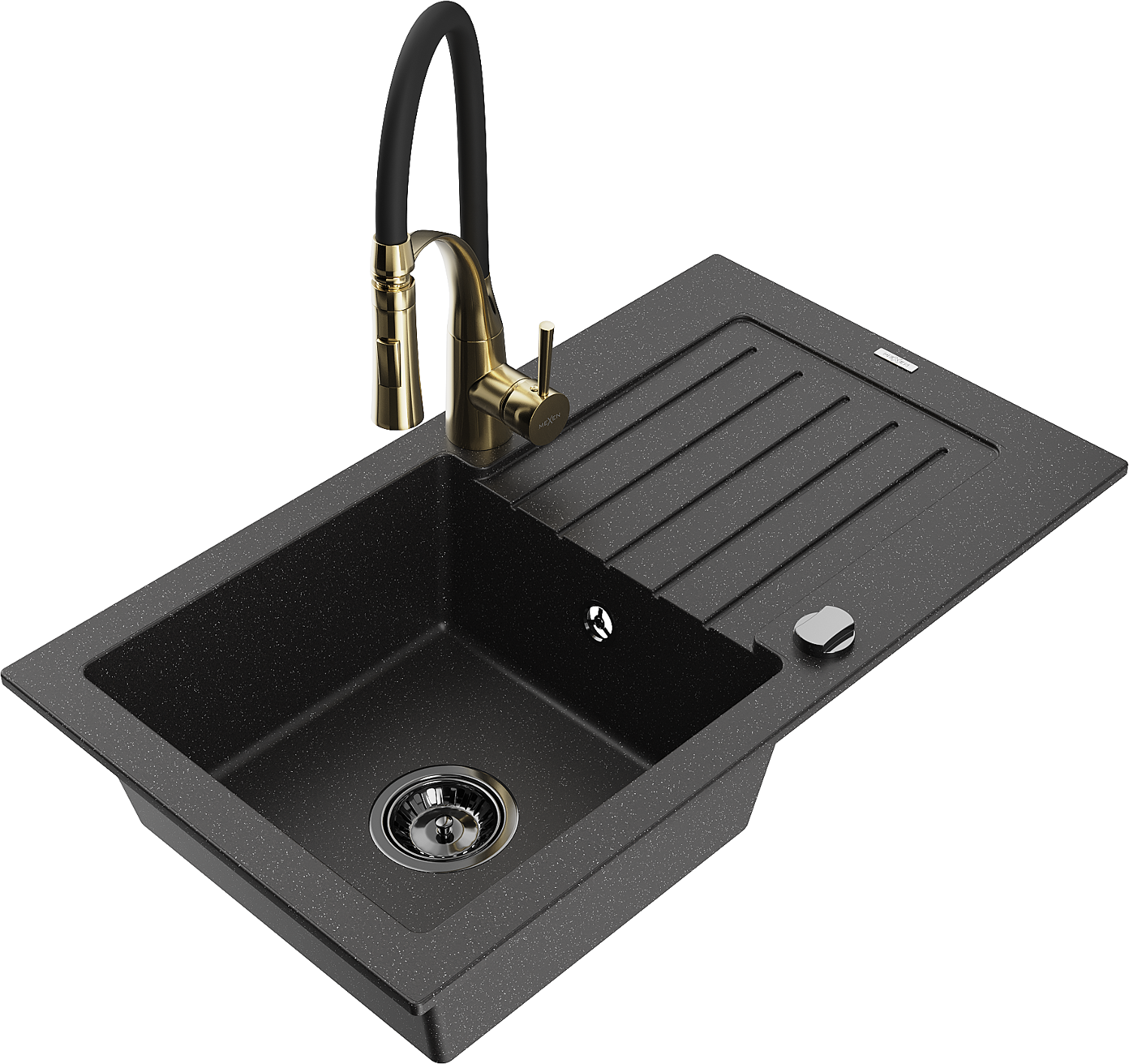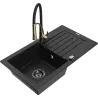 Mexen Pablo granieten gootsteen 1-komorige met afdruiprek en keukenkraan Aster, zwart/zilveren metallic - 6510-73-73450-57-B