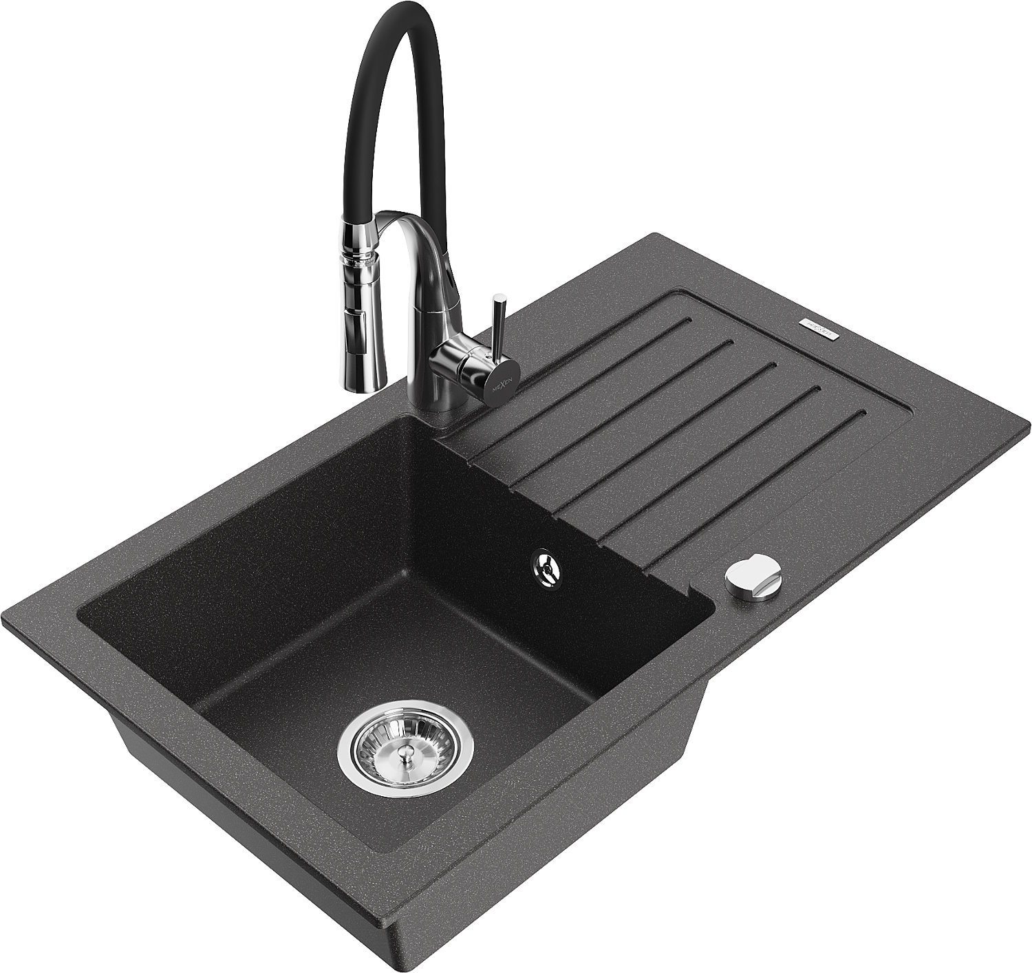 Mexen Pablo granieten gootsteen met 1 bak en afdruiprek en keukenmengkraan Aster, zwart gespikkeld - 6510-76-73450-07